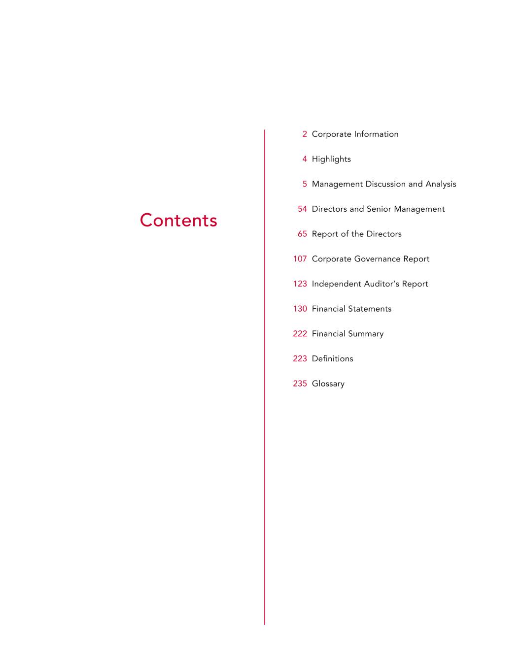 2 Corporate Information 4 Highlights 5 Management Discussion and Analysis 54 Directors and Senior Management 65 Report of the Directors 107 Corporate Governance Report 123 Independent Auditor’s Report 130 Financial Statements 222 Financial Summary 223 Definitions 235 Glossary Contents