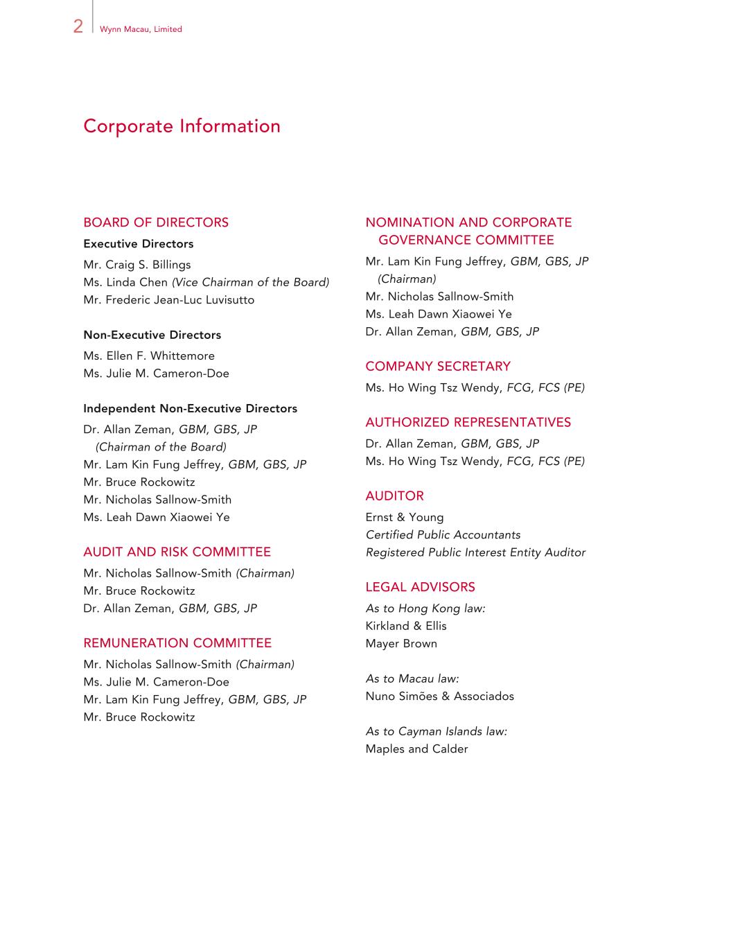 2 Wynn Macau, Limited Corporate Information BOARD OF DIRECTORS Executive Directors Mr. Craig S. Billings Ms. Linda Chen (Vice Chairman of the Board) Mr. Frederic Jean-Luc Luvisutto Non-Executive Directors Ms. Ellen F. Whittemore Ms. Julie M. Cameron-Doe Independent Non-Executive Directors Dr. Allan Zeman, GBM, GBS, JP (Chairman of the Board) Mr. Lam Kin Fung Jeffrey, GBM, GBS, JP Mr. Bruce Rockowitz Mr. Nicholas Sallnow-Smith Ms. Leah Dawn Xiaowei Ye AUDIT AND RISK COMMITTEE Mr. Nicholas Sallnow-Smith (Chairman) Mr. Bruce Rockowitz Dr. Allan Zeman, GBM, GBS, JP REMUNERATION COMMITTEE Mr. Nicholas Sallnow-Smith (Chairman) Ms. Julie M. Cameron-Doe Mr. Lam Kin Fung Jeffrey, GBM, GBS, JP Mr. Bruce Rockowitz NOMINATION AND CORPORATE GOVERNANCE COMMITTEE Mr. Lam Kin Fung Jeffrey, GBM, GBS, JP (Chairman) Mr. Nicholas Sallnow-Smith Ms. Leah Dawn Xiaowei Ye Dr. Allan Zeman, GBM, GBS, JP COMPANY SECRETARY Ms. Ho Wing Tsz Wendy, FCG, FCS (PE) AUTHORIZED REPRESENTATIVES Dr. Allan Zeman, GBM, GBS, JP Ms. Ho Wing Tsz Wendy, FCG, FCS (PE) AUDITOR Ernst & Young Certified Public Accountants Registered Public Interest Entity Auditor LEGAL ADVISORS As to Hong Kong law: Kirkland & Ellis Mayer Brown As to Macau law: Nuno Simões & Associados As to Cayman Islands law: Maples and Calder