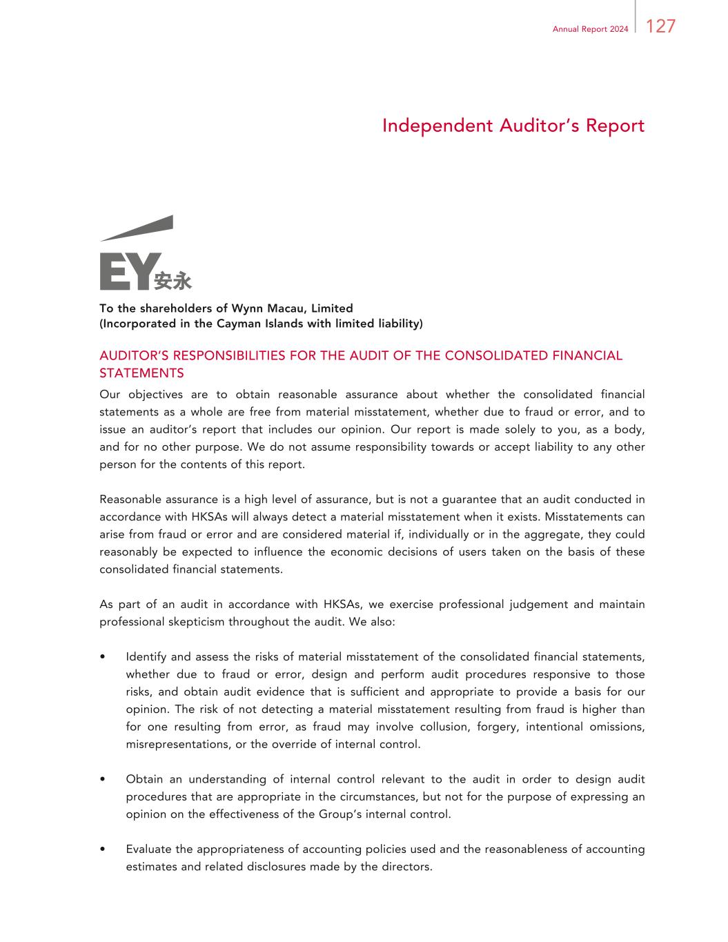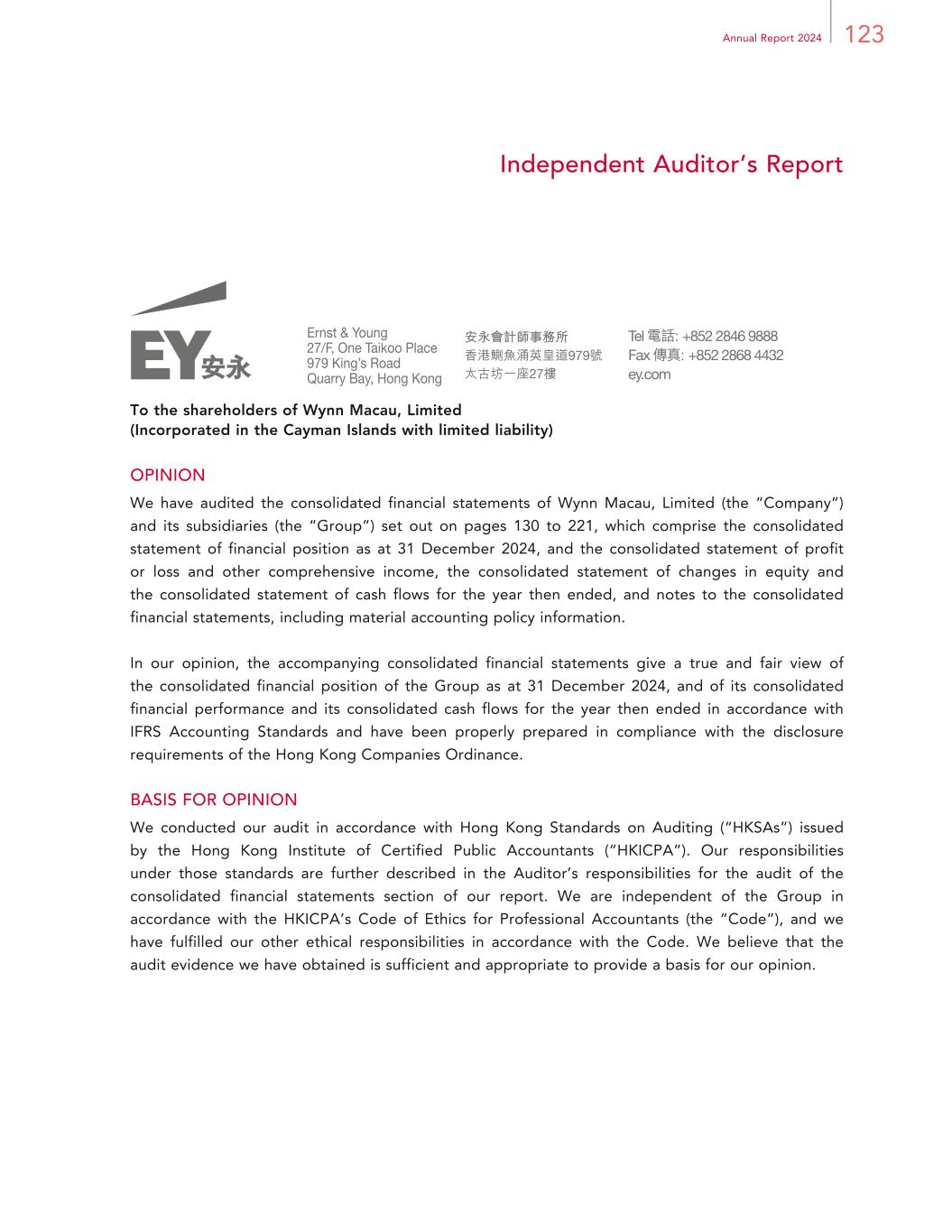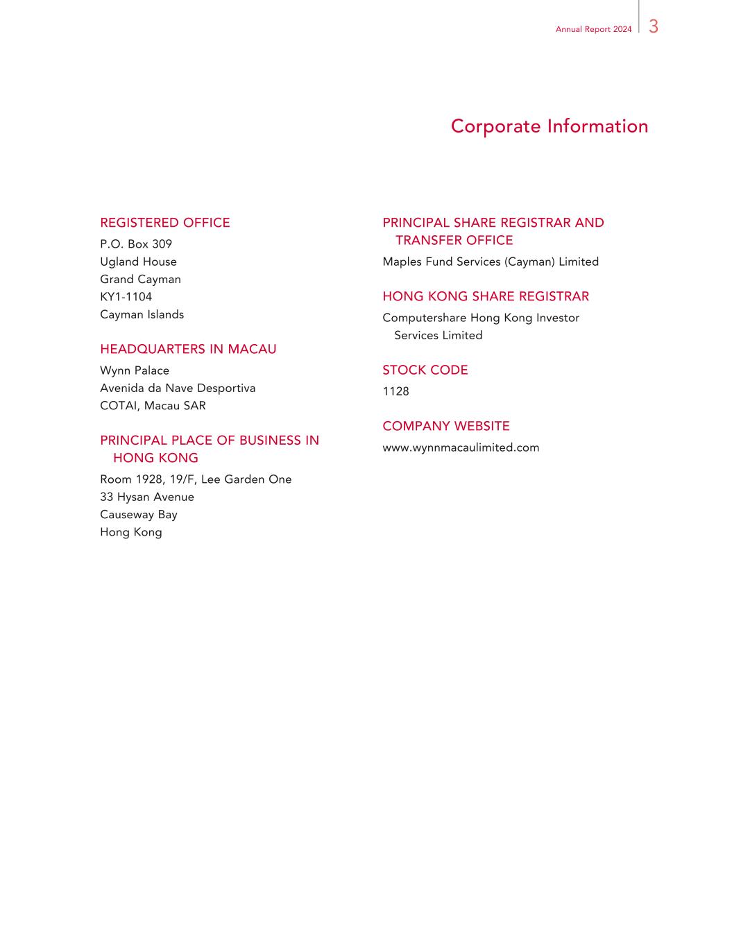 3Annual Report 2024 Corporate Information REGISTERED OFFICE P.O. Box 309 Ugland House Grand Cayman KY1-1104 Cayman Islands HEADQUARTERS IN MACAU Wynn Palace Avenida da Nave Desportiva COTAI, Macau SAR PRINCIPAL PLACE OF BUSINESS IN HONG KONG Room 1928, 19/F, Lee Garden One 33 Hysan Avenue Causeway Bay Hong Kong PRINCIPAL SHARE REGISTRAR AND TRANSFER OFFICE Maples Fund Services (Cayman) Limited HONG KONG SHARE REGISTRAR Computershare Hong Kong Investor Services Limited STOCK CODE 1128 COMPANY WEBSITE www.wynnmacaulimited.com