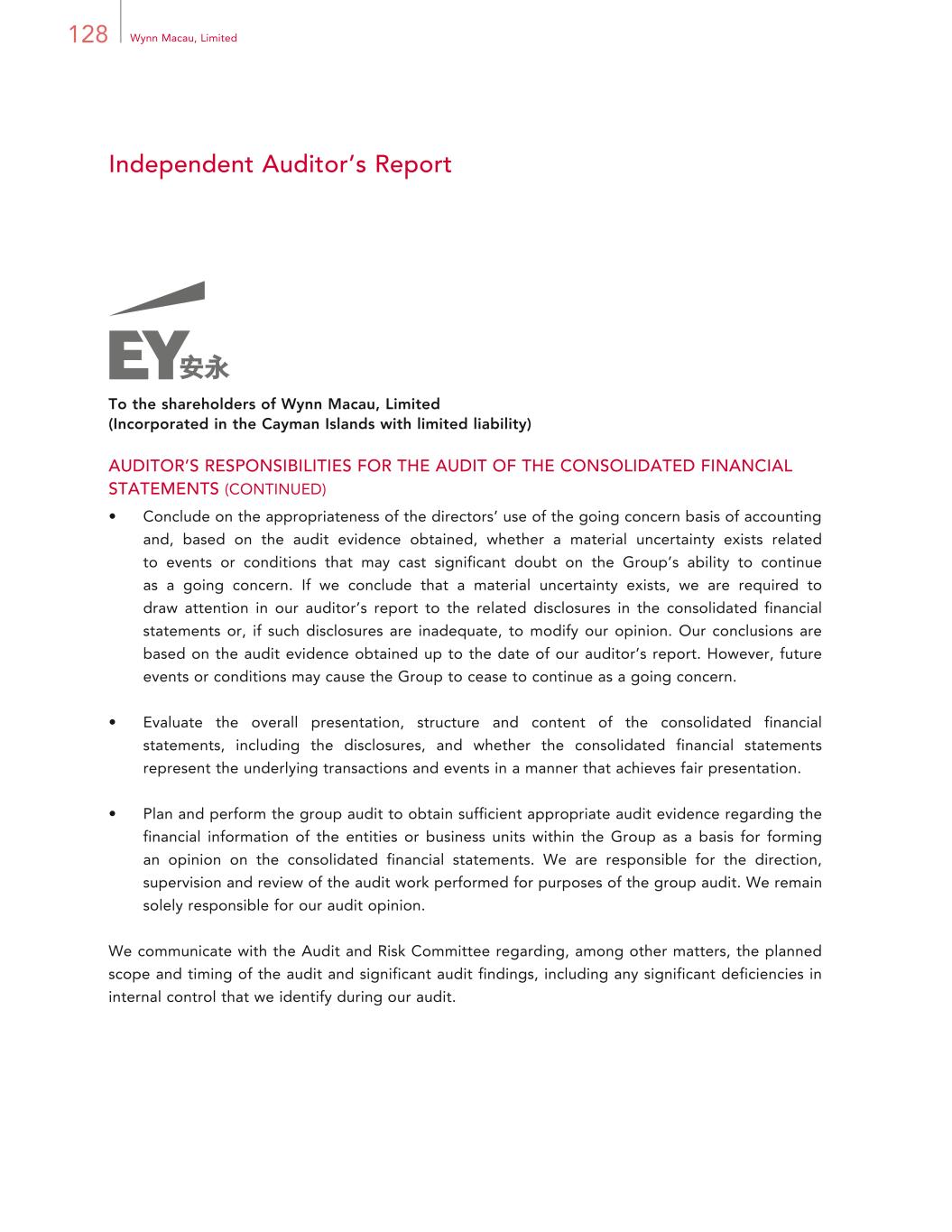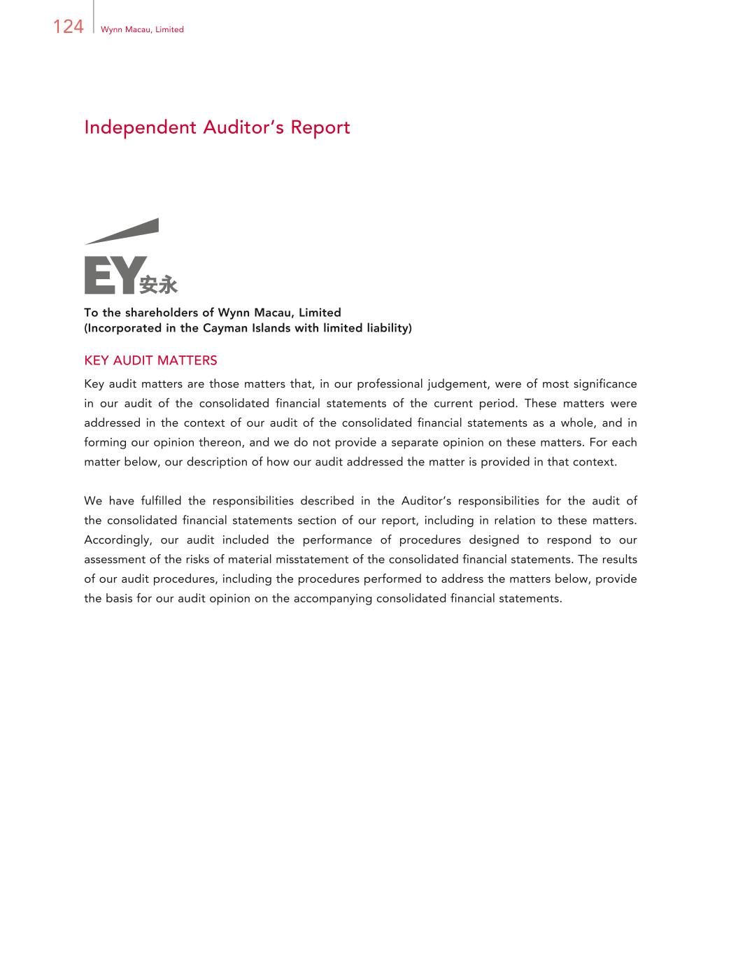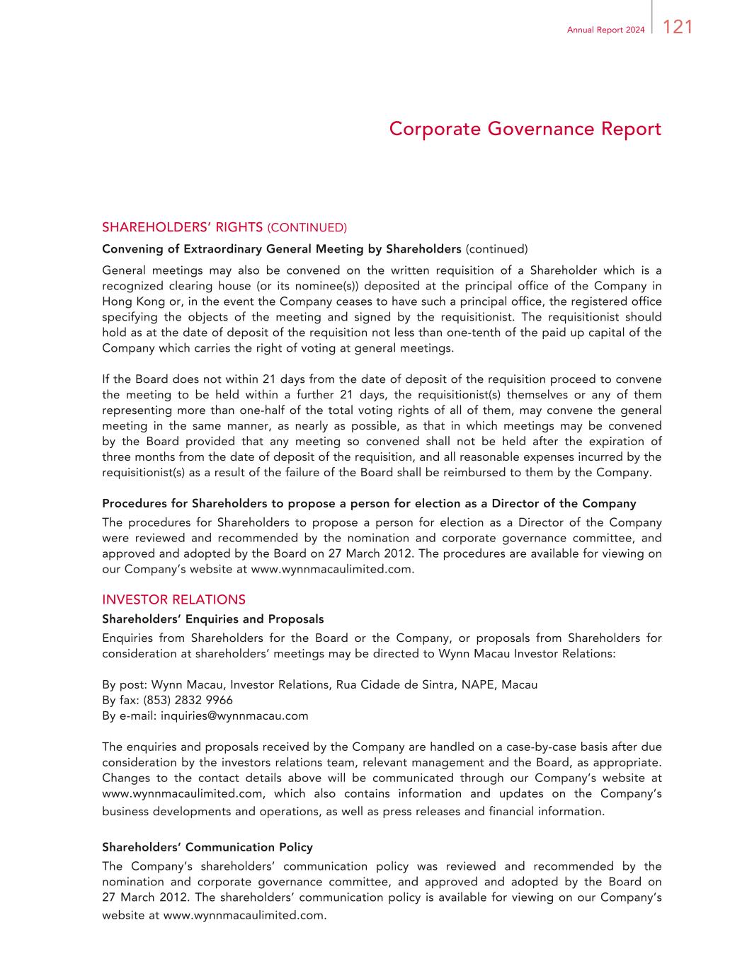 3Annual Report 2024 Corporate Information REGISTERED OFFICE P.O. Box 309 Ugland House Grand Cayman KY1-1104 Cayman Islands HEADQUARTERS IN MACAU Wynn Palace Avenida da Nave Desportiva COTAI, Macau SAR PRINCIPAL PLACE OF BUSINESS IN HONG KONG Room 1928, 19/F, Lee Garden One 33 Hysan Avenue Causeway Bay Hong Kong PRINCIPAL SHARE REGISTRAR AND TRANSFER OFFICE Maples Fund Services (Cayman) Limited HONG KONG SHARE REGISTRAR Computershare Hong Kong Investor Services Limited STOCK CODE 1128 COMPANY WEBSITE www.wynnmacaulimited.com
