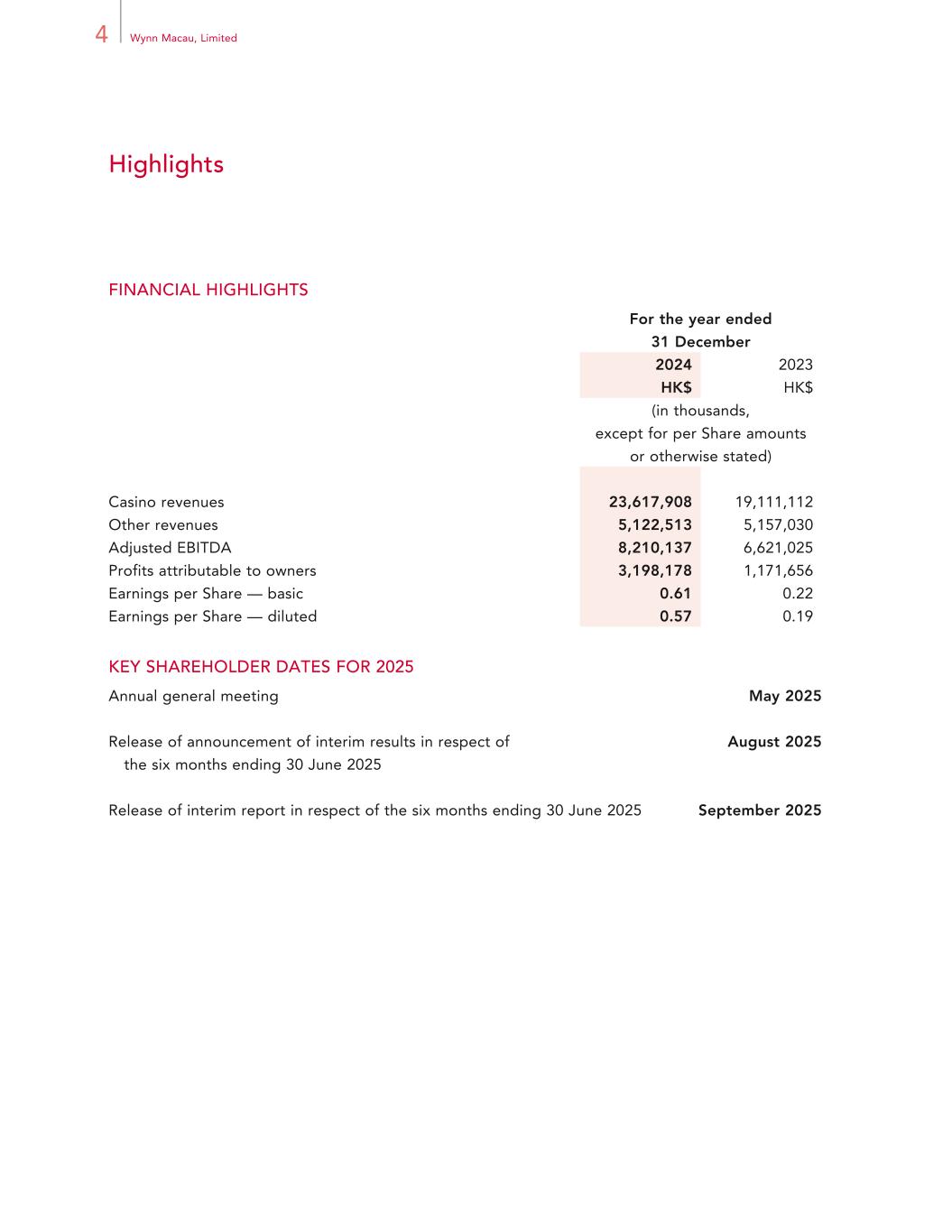 4 Wynn Macau, Limited Highlights FINANCIAL HIGHLIGHTS For the year ended 31 December 2024 2023 HK$ HK$ (in thousands, except for per Share amounts or otherwise stated) Casino revenues 23,617,908 19,111,112 Other revenues 5,122,513 5,157,030 Adjusted EBITDA 8,210,137 6,621,025 Profits attributable to owners 3,198,178 1,171,656 Earnings per Share — basic 0.61 0.22 Earnings per Share — diluted 0.57 0.19 KEY SHAREHOLDER DATES FOR 2025 Annual general meeting May 2025 Release of announcement of interim results in respect of the six months ending 30 June 2025 August 2025 Release of interim report in respect of the six months ending 30 June 2025 September 2025