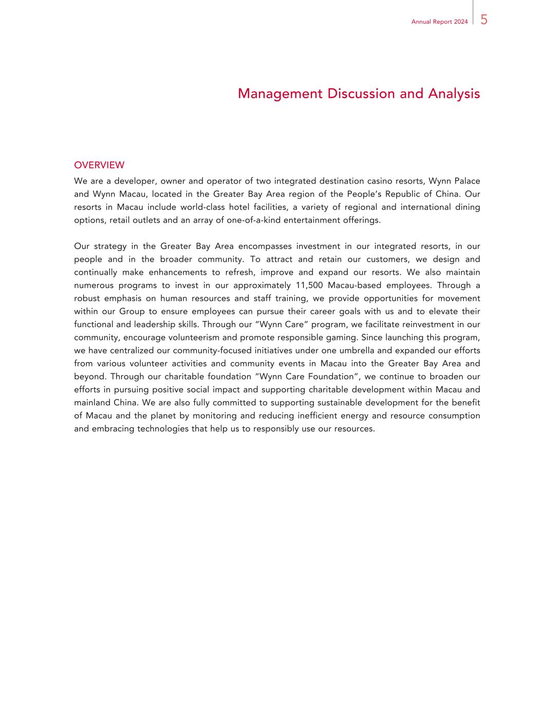 5Annual Report 2024 Management Discussion and Analysis OVERVIEW We are a developer, owner and operator of two integrated destination casino resorts, Wynn Palace and Wynn Macau, located in the Greater Bay Area region of the People’s Republic of China. Our resorts in Macau include world-class hotel facilities, a variety of regional and international dining options, retail outlets and an array of one-of-a-kind entertainment offerings. Our strategy in the Greater Bay Area encompasses investment in our integrated resorts, in our people and in the broader community. To attract and retain our customers, we design and continually make enhancements to refresh, improve and expand our resorts. We also maintain numerous programs to invest in our approximately 11,500 Macau-based employees. Through a robust emphasis on human resources and staff training, we provide opportunities for movement within our Group to ensure employees can pursue their career goals with us and to elevate their functional and leadership skills. Through our “Wynn Care” program, we facilitate reinvestment in our community, encourage volunteerism and promote responsible gaming. Since launching this program, we have centralized our community-focused initiatives under one umbrella and expanded our efforts from various volunteer activities and community events in Macau into the Greater Bay Area and beyond. Through our charitable foundation “Wynn Care Foundation”, we continue to broaden our efforts in pursuing positive social impact and supporting charitable development within Macau and mainland China. We are also fully committed to supporting sustainable development for the benefit of Macau and the planet by monitoring and reducing inefficient energy and resource consumption and embracing technologies that help us to responsibly use our resources.