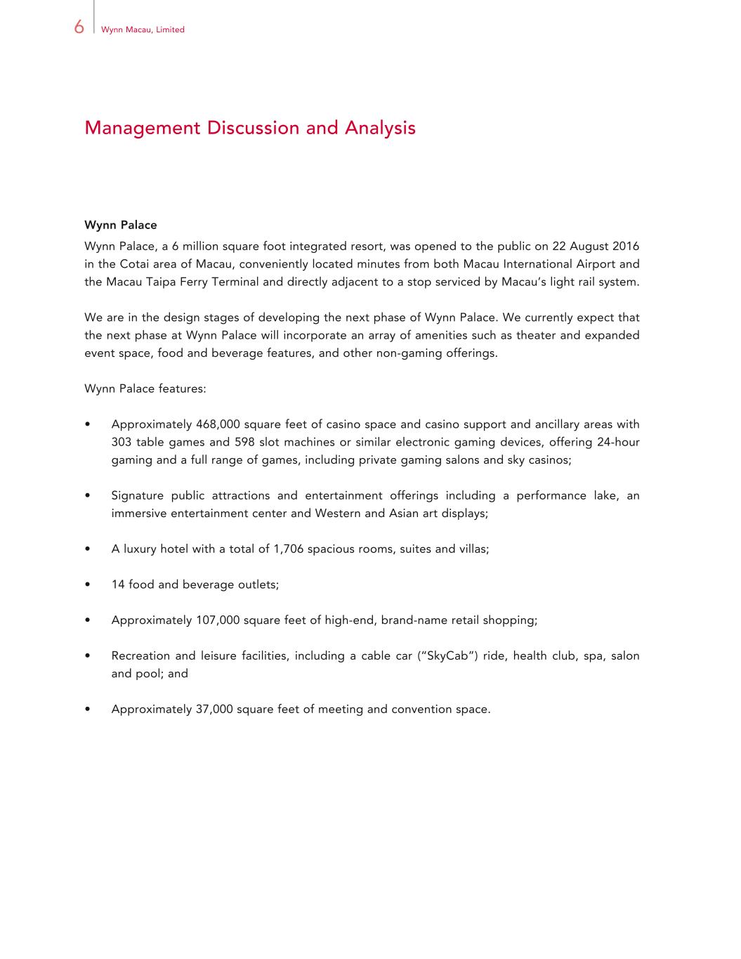 6 Wynn Macau, Limited Management Discussion and Analysis Wynn Palace Wynn Palace, a 6 million square foot integrated resort, was opened to the public on 22 August 2016 in the Cotai area of Macau, conveniently located minutes from both Macau International Airport and the Macau Taipa Ferry Terminal and directly adjacent to a stop serviced by Macau’s light rail system. We are in the design stages of developing the next phase of Wynn Palace. We currently expect that the next phase at Wynn Palace will incorporate an array of amenities such as theater and expanded event space, food and beverage features, and other non-gaming offerings. Wynn Palace features: • Approximately 468,000 square feet of casino space and casino support and ancillary areas with 303 table games and 598 slot machines or similar electronic gaming devices, offering 24-hour gaming and a full range of games, including private gaming salons and sky casinos; • Signature public attractions and entertainment offerings including a performance lake, an immersive entertainment center and Western and Asian art displays; • A luxury hotel with a total of 1,706 spacious rooms, suites and villas; • 14 food and beverage outlets; • Approximately 107,000 square feet of high-end, brand-name retail shopping; • Recreation and leisure facilities, including a cable car (“SkyCab”) ride, health club, spa, salon and pool; and • Approximately 37,000 square feet of meeting and convention space.