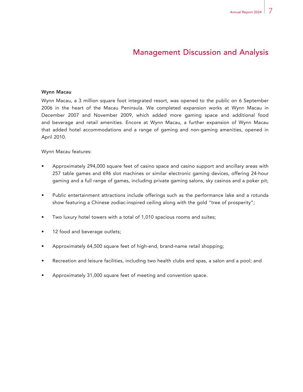 7Annual Report 2024 Management Discussion and Analysis Wynn Macau Wynn Macau, a 3 million square foot integrated resort, was opened to the public on 6 September 2006 in the heart of the Macau Peninsula. We completed expansion works at Wynn Macau in December 2007 and November 2009, which added more gaming space and additional food and beverage and retail amenities. Encore at Wynn Macau, a further expansion of Wynn Macau that added hotel accommodations and a range of gaming and non-gaming amenities, opened in April 2010. Wynn Macau features: • Approximately 294,000 square feet of casino space and casino support and ancillary areas with 257 table games and 696 slot machines or similar electronic gaming devices, offering 24-hour gaming and a full range of games, including private gaming salons, sky casinos and a poker pit; • Public entertainment attractions include offerings such as the performance lake and a rotunda show featuring a Chinese zodiac-inspired ceiling along with the gold “tree of prosperity”; • Two luxury hotel towers with a total of 1,010 spacious rooms and suites; • 12 food and beverage outlets; • Approximately 64,500 square feet of high-end, brand-name retail shopping; • Recreation and leisure facilities, including two health clubs and spas, a salon and a pool; and • Approximately 31,000 square feet of meeting and convention space.