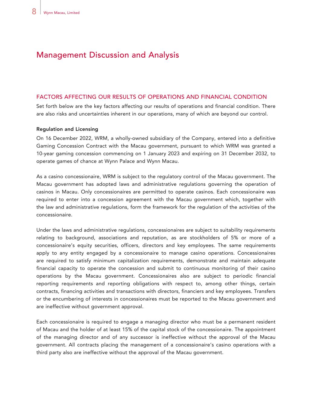 8 Wynn Macau, Limited Management Discussion and Analysis FACTORS AFFECTING OUR RESULTS OF OPERATIONS AND FINANCIAL CONDITION Set forth below are the key factors affecting our results of operations and financial condition. There are also risks and uncertainties inherent in our operations, many of which are beyond our control. Regulation and Licensing On 16 December 2022, WRM, a wholly-owned subsidiary of the Company, entered into a definitive Gaming Concession Contract with the Macau government, pursuant to which WRM was granted a 10-year gaming concession commencing on 1 January 2023 and expiring on 31 December 2032, to operate games of chance at Wynn Palace and Wynn Macau. As a casino concessionaire, WRM is subject to the regulatory control of the Macau government. The Macau government has adopted laws and administrative regulations governing the operation of casinos in Macau. Only concessionaires are permitted to operate casinos. Each concessionaire was required to enter into a concession agreement with the Macau government which, together with the law and administrative regulations, form the framework for the regulation of the activities of the concessionaire. Under the laws and administrative regulations, concessionaires are subject to suitability requirements relating to background, associations and reputation, as are stockholders of 5% or more of a concessionaire’s equity securities, officers, directors and key employees. The same requirements apply to any entity engaged by a concessionaire to manage casino operations. Concessionaires are required to satisfy minimum capitalization requirements, demonstrate and maintain adequate financial capacity to operate the concession and submit to continuous monitoring of their casino operations by the Macau government. Concessionaires also are subject to periodic financial reporting requirements and reporting obligations with respect to, among other things, certain contracts, financing activities and transactions with directors, financiers and key employees. Transfers or the encumbering of interests in concessionaires must be reported to the Macau government and are ineffective without government approval. Each concessionaire is required to engage a managing director who must be a permanent resident of Macau and the holder of at least 15% of the capital stock of the concessionaire. The appointment of the managing director and of any successor is ineffective without the approval of the Macau government. All contracts placing the management of a concessionaire’s casino operations with a third party also are ineffective without the approval of the Macau government.