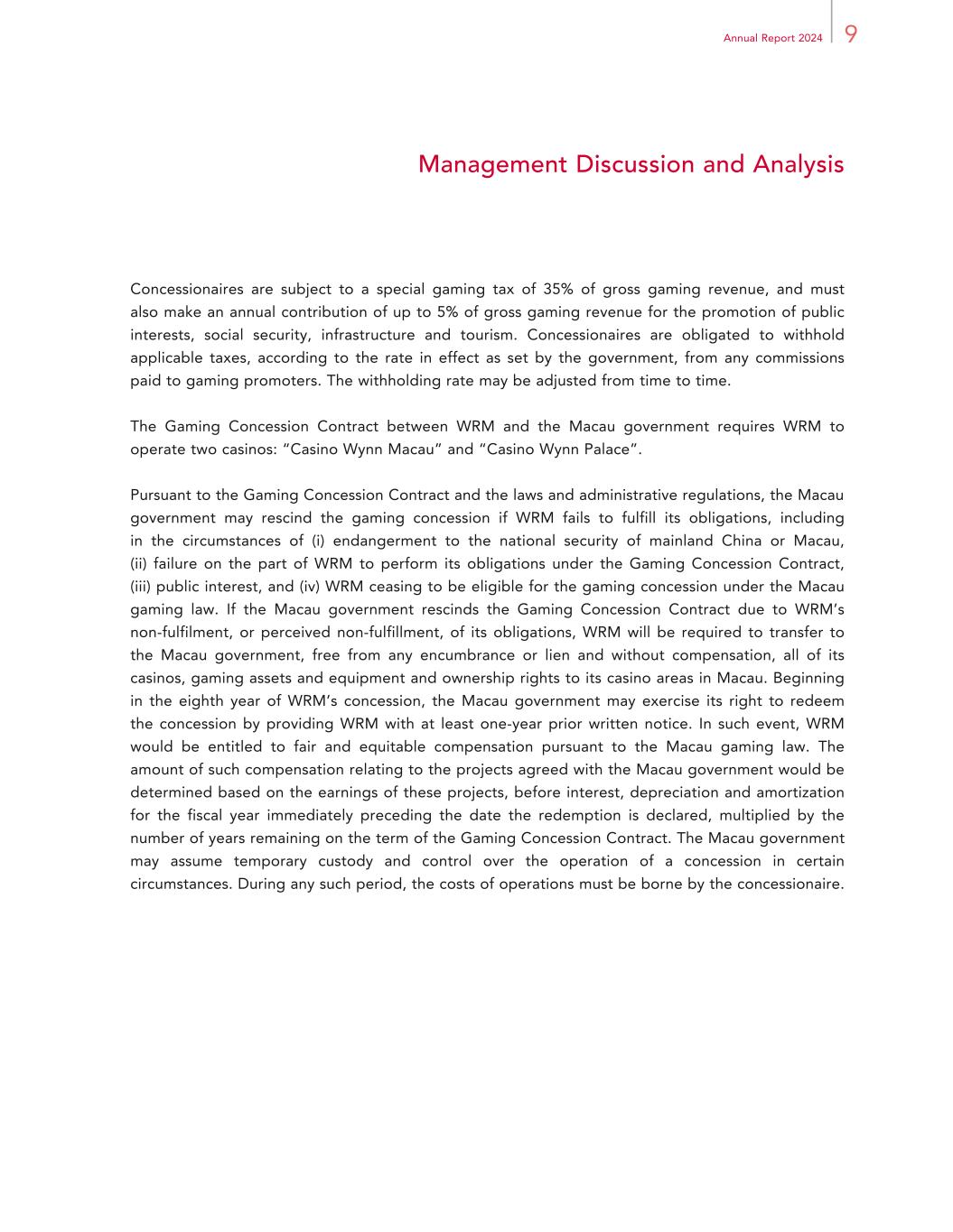 9Annual Report 2024 Management Discussion and Analysis Concessionaires are subject to a special gaming tax of 35% of gross gaming revenue, and must also make an annual contribution of up to 5% of gross gaming revenue for the promotion of public interests, social security, infrastructure and tourism. Concessionaires are obligated to withhold applicable taxes, according to the rate in effect as set by the government, from any commissions paid to gaming promoters. The withholding rate may be adjusted from time to time. The Gaming Concession Contract between WRM and the Macau government requires WRM to operate two casinos: “Casino Wynn Macau” and “Casino Wynn Palace”. Pursuant to the Gaming Concession Contract and the laws and administrative regulations, the Macau government may rescind the gaming concession if WRM fails to fulfill its obligations, including in the circumstances of (i) endangerment to the national security of mainland China or Macau, (ii) failure on the part of WRM to perform its obligations under the Gaming Concession Contract, (iii) public interest, and (iv) WRM ceasing to be eligible for the gaming concession under the Macau gaming law. If the Macau government rescinds the Gaming Concession Contract due to WRM’s non-fulfilment, or perceived non-fulfillment, of its obligations, WRM will be required to transfer to the Macau government, free from any encumbrance or lien and without compensation, all of its casinos, gaming assets and equipment and ownership rights to its casino areas in Macau. Beginning in the eighth year of WRM’s concession, the Macau government may exercise its right to redeem the concession by providing WRM with at least one-year prior written notice. In such event, WRM would be entitled to fair and equitable compensation pursuant to the Macau gaming law. The amount of such compensation relating to the projects agreed with the Macau government would be determined based on the earnings of these projects, before interest, depreciation and amortization for the fiscal year immediately preceding the date the redemption is declared, multiplied by the number of years remaining on the term of the Gaming Concession Contract. The Macau government may assume temporary custody and control over the operation of a concession in certain circumstances. During any such period, the costs of operations must be borne by the concessionaire.