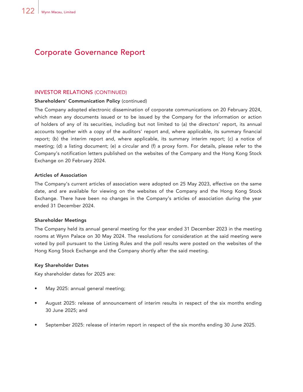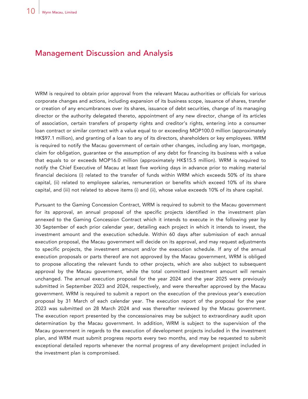 10 Wynn Macau, Limited Management Discussion and Analysis WRM is required to obtain prior approval from the relevant Macau authorities or officials for various corporate changes and actions, including expansion of its business scope, issuance of shares, transfer or creation of any encumbrances over its shares, issuance of debt securities, change of its managing director or the authority delegated thereto, appointment of any new director, change of its articles of association, certain transfers of property rights and creditor’s rights, entering into a consumer loan contract or similar contract with a value equal to or exceeding MOP100.0 million (approximately HK$97.1 million), and granting of a loan to any of its directors, shareholders or key employees. WRM is required to notify the Macau government of certain other changes, including any loan, mortgage, claim for obligation, guarantee or the assumption of any debt for financing its business with a value that equals to or exceeds MOP16.0 million (approximately HK$15.5 million). WRM is required to notify the Chief Executive of Macau at least five working days in advance prior to making material financial decisions (i) related to the transfer of funds within WRM which exceeds 50% of its share capital, (ii) related to employee salaries, remuneration or benefits which exceed 10% of its share capital, and (iii) not related to above items (i) and (ii), whose value exceeds 10% of its share capital. Pursuant to the Gaming Concession Contract, WRM is required to submit to the Macau government for its approval, an annual proposal of the specific projects identified in the investment plan annexed to the Gaming Concession Contract which it intends to execute in the following year by 30 September of each prior calendar year, detailing each project in which it intends to invest, the investment amount and the execution schedule. Within 60 days after submission of each annual execution proposal, the Macau government will decide on its approval, and may request adjustments to specific projects, the investment amount and/or the execution schedule. If any of the annual execution proposals or parts thereof are not approved by the Macau government, WRM is obliged to propose allocating the relevant funds to other projects, which are also subject to subsequent approval by the Macau government, while the total committed investment amount will remain unchanged. The annual execution proposal for the year 2024 and the year 2025 were previously submitted in September 2023 and 2024, respectively, and were thereafter approved by the Macau government. WRM is required to submit a report on the execution of the previous year’s execution proposal by 31 March of each calendar year. The execution report of the proposal for the year 2023 was submitted on 28 March 2024 and was thereafter reviewed by the Macau government. The execution report presented by the concessionaires may be subject to extraordinary audit upon determination by the Macau government. In addition, WRM is subject to the supervision of the Macau government in regards to the execution of development projects included in the investment plan, and WRM must submit progress reports every two months, and may be requested to submit exceptional detailed reports whenever the normal progress of any development project included in the investment plan is compromised.