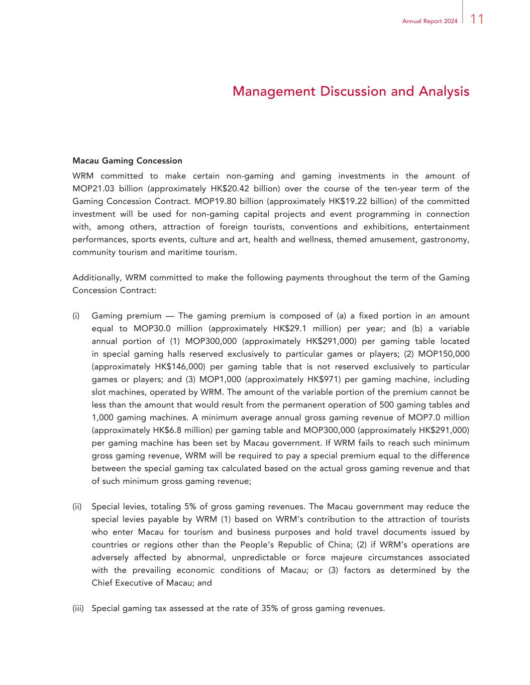 11Annual Report 2024 Management Discussion and Analysis Macau Gaming Concession WRM committed to make certain non-gaming and gaming investments in the amount of MOP21.03 billion (approximately HK$20.42 billion) over the course of the ten-year term of the Gaming Concession Contract. MOP19.80 billion (approximately HK$19.22 billion) of the committed investment will be used for non-gaming capital projects and event programming in connection with, among others, attraction of foreign tourists, conventions and exhibitions, entertainment performances, sports events, culture and art, health and wellness, themed amusement, gastronomy, community tourism and maritime tourism. Additionally, WRM committed to make the following payments throughout the term of the Gaming Concession Contract: (i) Gaming premium — The gaming premium is composed of (a) a fixed portion in an amount equal to MOP30.0 million (approximately HK$29.1 million) per year; and (b) a variable annual portion of (1) MOP300,000 (approximately HK$291,000) per gaming table located in special gaming halls reserved exclusively to particular games or players; (2) MOP150,000 (approximately HK$146,000) per gaming table that is not reserved exclusively to particular games or players; and (3) MOP1,000 (approximately HK$971) per gaming machine, including slot machines, operated by WRM. The amount of the variable portion of the premium cannot be less than the amount that would result from the permanent operation of 500 gaming tables and 1,000 gaming machines. A minimum average annual gross gaming revenue of MOP7.0 million (approximately HK$6.8 million) per gaming table and MOP300,000 (approximately HK$291,000) per gaming machine has been set by Macau government. If WRM fails to reach such minimum gross gaming revenue, WRM will be required to pay a special premium equal to the difference between the special gaming tax calculated based on the actual gross gaming revenue and that of such minimum gross gaming revenue; (ii) Special levies, totaling 5% of gross gaming revenues. The Macau government may reduce the special levies payable by WRM (1) based on WRM’s contribution to the attraction of tourists who enter Macau for tourism and business purposes and hold travel documents issued by countries or regions other than the People’s Republic of China; (2) if WRM’s operations are adversely affected by abnormal, unpredictable or force majeure circumstances associated with the prevailing economic conditions of Macau; or (3) factors as determined by the Chief Executive of Macau; and (iii) Special gaming tax assessed at the rate of 35% of gross gaming revenues.