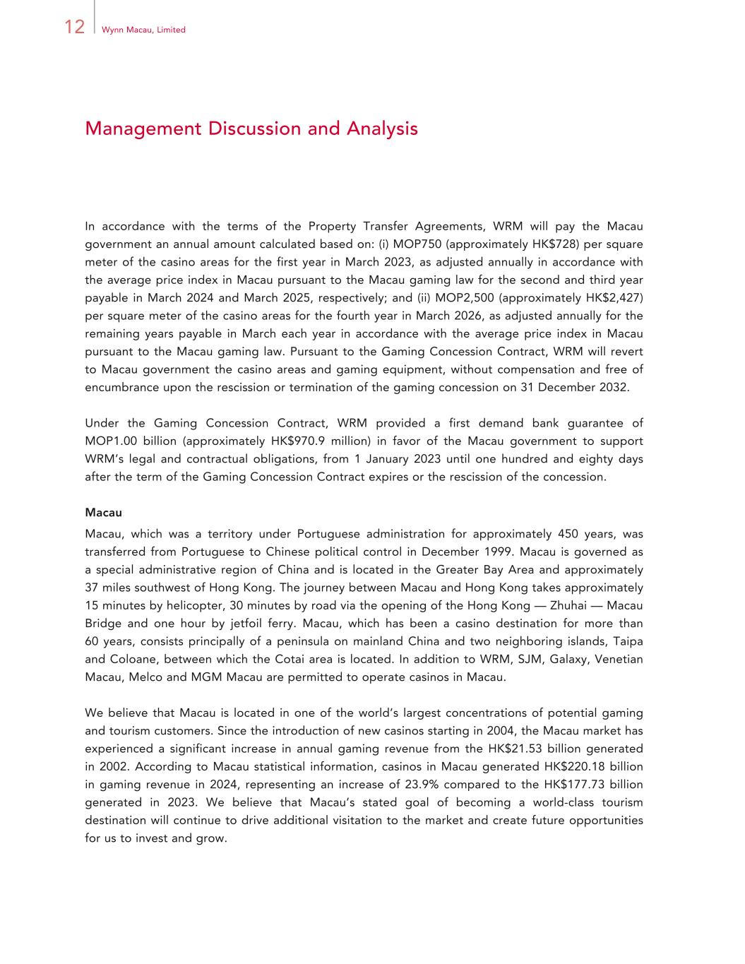 12 Wynn Macau, Limited Management Discussion and Analysis In accordance with the terms of the Property Transfer Agreements, WRM will pay the Macau government an annual amount calculated based on: (i) MOP750 (approximately HK$728) per square meter of the casino areas for the first year in March 2023, as adjusted annually in accordance with the average price index in Macau pursuant to the Macau gaming law for the second and third year payable in March 2024 and March 2025, respectively; and (ii) MOP2,500 (approximately HK$2,427) per square meter of the casino areas for the fourth year in March 2026, as adjusted annually for the remaining years payable in March each year in accordance with the average price index in Macau pursuant to the Macau gaming law. Pursuant to the Gaming Concession Contract, WRM will revert to Macau government the casino areas and gaming equipment, without compensation and free of encumbrance upon the rescission or termination of the gaming concession on 31 December 2032. Under the Gaming Concession Contract, WRM provided a first demand bank guarantee of MOP1.00 billion (approximately HK$970.9 million) in favor of the Macau government to support WRM’s legal and contractual obligations, from 1 January 2023 until one hundred and eighty days after the term of the Gaming Concession Contract expires or the rescission of the concession. Macau Macau, which was a territory under Portuguese administration for approximately 450 years, was transferred from Portuguese to Chinese political control in December 1999. Macau is governed as a special administrative region of China and is located in the Greater Bay Area and approximately 37 miles southwest of Hong Kong. The journey between Macau and Hong Kong takes approximately 15 minutes by helicopter, 30 minutes by road via the opening of the Hong Kong — Zhuhai — Macau Bridge and one hour by jetfoil ferry. Macau, which has been a casino destination for more than 60 years, consists principally of a peninsula on mainland China and two neighboring islands, Taipa and Coloane, between which the Cotai area is located. In addition to WRM, SJM, Galaxy, Venetian Macau, Melco and MGM Macau are permitted to operate casinos in Macau. We believe that Macau is located in one of the world’s largest concentrations of potential gaming and tourism customers. Since the introduction of new casinos starting in 2004, the Macau market has experienced a significant increase in annual gaming revenue from the HK$21.53 billion generated in 2002. According to Macau statistical information, casinos in Macau generated HK$220.18 billion in gaming revenue in 2024, representing an increase of 23.9% compared to the HK$177.73 billion generated in 2023. We believe that Macau’s stated goal of becoming a world-class tourism destination will continue to drive additional visitation to the market and create future opportunities for us to invest and grow.