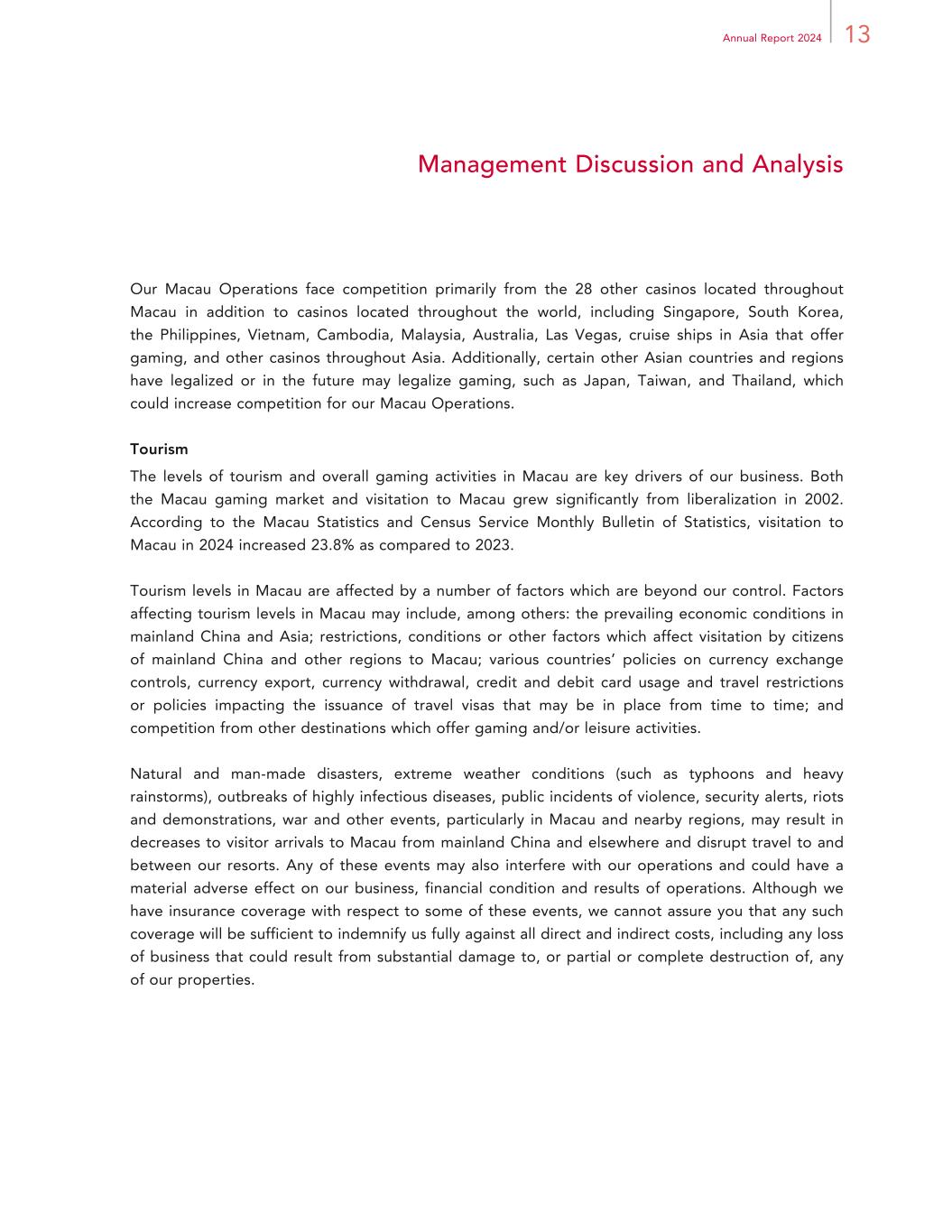 13Annual Report 2024 Management Discussion and Analysis Our Macau Operations face competition primarily from the 28 other casinos located throughout Macau in addition to casinos located throughout the world, including Singapore, South Korea, the Philippines, Vietnam, Cambodia, Malaysia, Australia, Las Vegas, cruise ships in Asia that offer gaming, and other casinos throughout Asia. Additionally, certain other Asian countries and regions have legalized or in the future may legalize gaming, such as Japan, Taiwan, and Thailand, which could increase competition for our Macau Operations. Tourism The levels of tourism and overall gaming activities in Macau are key drivers of our business. Both the Macau gaming market and visitation to Macau grew significantly from liberalization in 2002. According to the Macau Statistics and Census Service Monthly Bulletin of Statistics, visitation to Macau in 2024 increased 23.8% as compared to 2023. Tourism levels in Macau are affected by a number of factors which are beyond our control. Factors affecting tourism levels in Macau may include, among others: the prevailing economic conditions in mainland China and Asia; restrictions, conditions or other factors which affect visitation by citizens of mainland China and other regions to Macau; various countries’ policies on currency exchange controls, currency export, currency withdrawal, credit and debit card usage and travel restrictions or policies impacting the issuance of travel visas that may be in place from time to time; and competition from other destinations which offer gaming and/or leisure activities. Natural and man-made disasters, extreme weather conditions (such as typhoons and heavy rainstorms), outbreaks of highly infectious diseases, public incidents of violence, security alerts, riots and demonstrations, war and other events, particularly in Macau and nearby regions, may result in decreases to visitor arrivals to Macau from mainland China and elsewhere and disrupt travel to and between our resorts. Any of these events may also interfere with our operations and could have a material adverse effect on our business, financial condition and results of operations. Although we have insurance coverage with respect to some of these events, we cannot assure you that any such coverage will be sufficient to indemnify us fully against all direct and indirect costs, including any loss of business that could result from substantial damage to, or partial or complete destruction of, any of our properties.