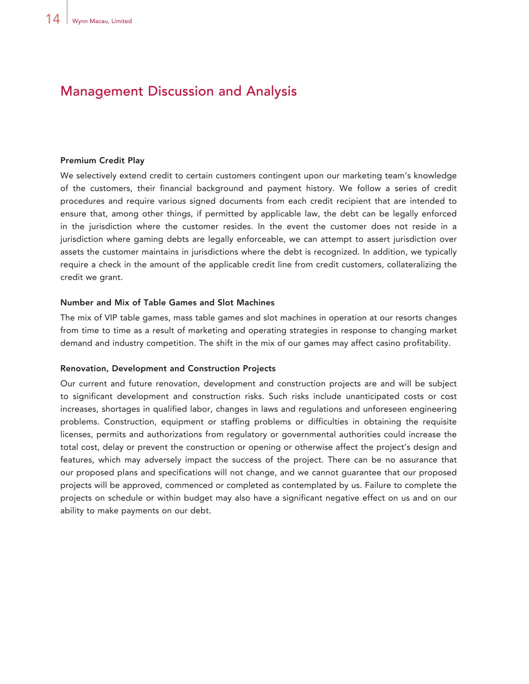 14 Wynn Macau, Limited Management Discussion and Analysis Premium Credit Play We selectively extend credit to certain customers contingent upon our marketing team’s knowledge of the customers, their financial background and payment history. We follow a series of credit procedures and require various signed documents from each credit recipient that are intended to ensure that, among other things, if permitted by applicable law, the debt can be legally enforced in the jurisdiction where the customer resides. In the event the customer does not reside in a jurisdiction where gaming debts are legally enforceable, we can attempt to assert jurisdiction over assets the customer maintains in jurisdictions where the debt is recognized. In addition, we typically require a check in the amount of the applicable credit line from credit customers, collateralizing the credit we grant. Number and Mix of Table Games and Slot Machines The mix of VIP table games, mass table games and slot machines in operation at our resorts changes from time to time as a result of marketing and operating strategies in response to changing market demand and industry competition. The shift in the mix of our games may affect casino profitability. Renovation, Development and Construction Projects Our current and future renovation, development and construction projects are and will be subject to significant development and construction risks. Such risks include unanticipated costs or cost increases, shortages in qualified labor, changes in laws and regulations and unforeseen engineering problems. Construction, equipment or staffing problems or difficulties in obtaining the requisite licenses, permits and authorizations from regulatory or governmental authorities could increase the total cost, delay or prevent the construction or opening or otherwise affect the project’s design and features, which may adversely impact the success of the project. There can be no assurance that our proposed plans and specifications will not change, and we cannot guarantee that our proposed projects will be approved, commenced or completed as contemplated by us. Failure to complete the projects on schedule or within budget may also have a significant negative effect on us and on our ability to make payments on our debt.