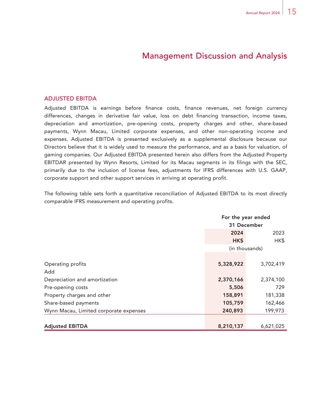 15Annual Report 2024 Management Discussion and Analysis ADJUSTED EBITDA Adjusted EBITDA is earnings before finance costs, finance revenues, net foreign currency differences, changes in derivative fair value, loss on debt financing transaction, income taxes, depreciation and amortization, pre-opening costs, property charges and other, share-based payments, Wynn Macau, Limited corporate expenses, and other non-operating income and expenses. Adjusted EBITDA is presented exclusively as a supplemental disclosure because our Directors believe that it is widely used to measure the performance, and as a basis for valuation, of gaming companies. Our Adjusted EBITDA presented herein also differs from the Adjusted Property EBITDAR presented by Wynn Resorts, Limited for its Macau segments in its filings with the SEC, primarily due to the inclusion of license fees, adjustments for IFRS differences with U.S. GAAP, corporate support and other support services in arriving at operating profit. The following table sets forth a quantitative reconciliation of Adjusted EBITDA to its most directly comparable IFRS measurement and operating profits. For the year ended 31 December 2024 2023 HK$ HK$ (in thousands) Operating profits 5,328,922 3,702,419 Add Depreciation and amortization 2,370,166 2,374,100 Pre-opening costs 5,506 729 Property charges and other 158,891 181,338 Share-based payments 105,759 162,466 Wynn Macau, Limited corporate expenses 240,893 199,973 Adjusted EBITDA 8,210,137 6,621,025