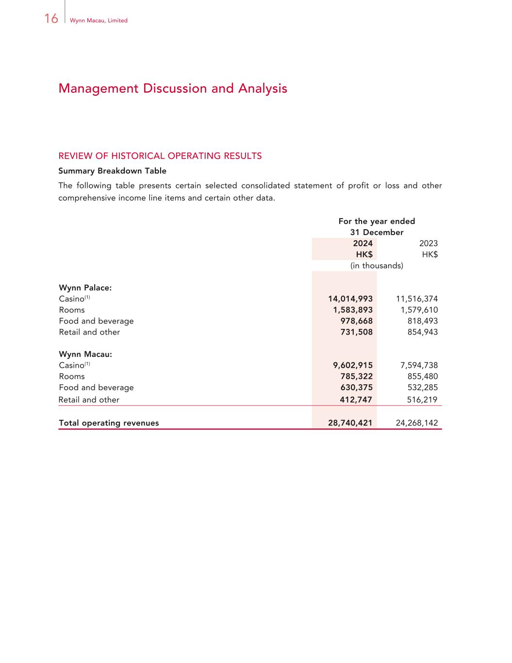 16 Wynn Macau, Limited Management Discussion and Analysis REVIEW OF HISTORICAL OPERATING RESULTS Summary Breakdown Table The following table presents certain selected consolidated statement of profit or loss and other comprehensive income line items and certain other data. For the year ended 31 December 2024 2023 HK$ HK$ (in thousands) Wynn Palace: Casino(1) 14,014,993 11,516,374 Rooms 1,583,893 1,579,610 Food and beverage 978,668 818,493 Retail and other 731,508 854,943 Wynn Macau: Casino(1) 9,602,915 7,594,738 Rooms 785,322 855,480 Food and beverage 630,375 532,285 Retail and other 412,747 516,219 Total operating revenues 28,740,421 24,268,142