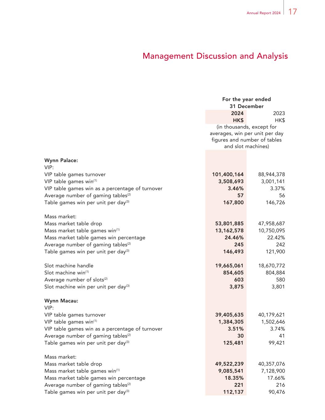 17Annual Report 2024 Management Discussion and Analysis For the year ended 31 December 2024 2023 HK$ HK$ (in thousands, except for averages, win per unit per day figures and number of tables and slot machines) Wynn Palace: VIP: VIP table games turnover 101,400,164 88,944,378 VIP table games win(1) 3,508,693 3,001,141 VIP table games win as a percentage of turnover 3.46% 3.37% Average number of gaming tables(2) 57 56 Table games win per unit per day(3) 167,800 146,726 Mass market: Mass market table drop 53,801,885 47,958,687 Mass market table games win(1) 13,162,578 10,750,095 Mass market table games win percentage 24.46% 22.42% Average number of gaming tables(2) 245 242 Table games win per unit per day(3) 146,493 121,900 Slot machine handle 19,665,061 18,670,772 Slot machine win(1) 854,605 804,884 Average number of slots(2) 603 580 Slot machine win per unit per day(3) 3,875 3,801 Wynn Macau: VIP: VIP table games turnover 39,405,635 40,179,621 VIP table games win(1) 1,384,305 1,502,646 VIP table games win as a percentage of turnover 3.51% 3.74% Average number of gaming tables(2) 30 41 Table games win per unit per day(3) 125,481 99,421 Mass market: Mass market table drop 49,522,239 40,357,076 Mass market table games win(1) 9,085,541 7,128,900 Mass market table games win percentage 18.35% 17.66% Average number of gaming tables(2) 221 216 Table games win per unit per day(3) 112,137 90,476