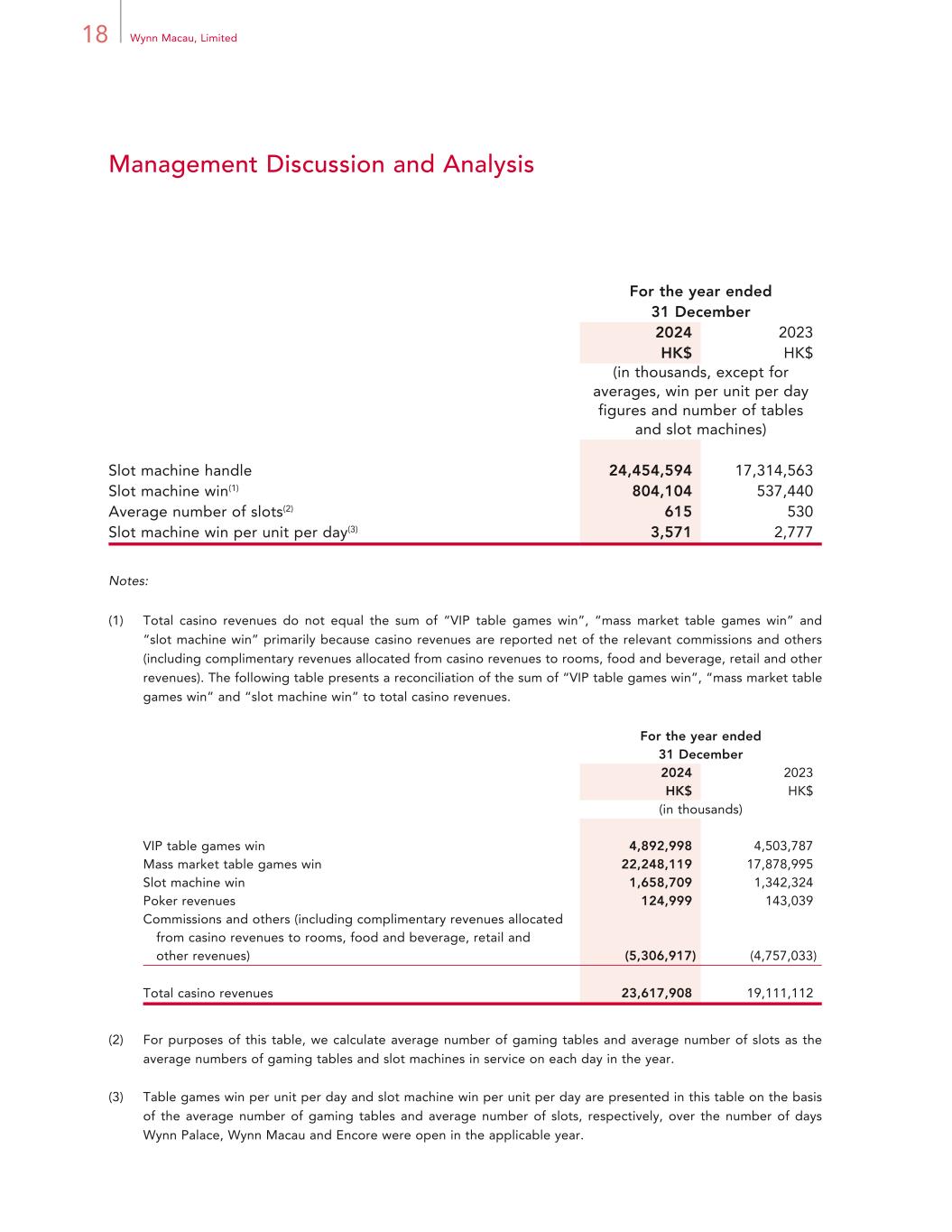 18 Wynn Macau, Limited Management Discussion and Analysis For the year ended 31 December 2024 2023 HK$ HK$ (in thousands, except for averages, win per unit per day figures and number of tables and slot machines) Slot machine handle 24,454,594 17,314,563 Slot machine win(1) 804,104 537,440 Average number of slots(2) 615 530 Slot machine win per unit per day(3) 3,571 2,777 Notes: (1) Total casino revenues do not equal the sum of “VIP table games win”, “mass market table games win” and “slot machine win” primarily because casino revenues are reported net of the relevant commissions and others (including complimentary revenues allocated from casino revenues to rooms, food and beverage, retail and other revenues). The following table presents a reconciliation of the sum of “VIP table games win”, “mass market table games win” and “slot machine win” to total casino revenues. For the year ended 31 December 2024 2023 HK$ HK$ (in thousands) VIP table games win 4,892,998 4,503,787 Mass market table games win 22,248,119 17,878,995 Slot machine win 1,658,709 1,342,324 Poker revenues 124,999 143,039 Commissions and others (including complimentary revenues allocated from casino revenues to rooms, food and beverage, retail and other revenues) (5,306,917) (4,757,033) Total casino revenues 23,617,908 19,111,112 (2) For purposes of this table, we calculate average number of gaming tables and average number of slots as the average numbers of gaming tables and slot machines in service on each day in the year. (3) Table games win per unit per day and slot machine win per unit per day are presented in this table on the basis of the average number of gaming tables and average number of slots, respectively, over the number of days Wynn Palace, Wynn Macau and Encore were open in the applicable year.
