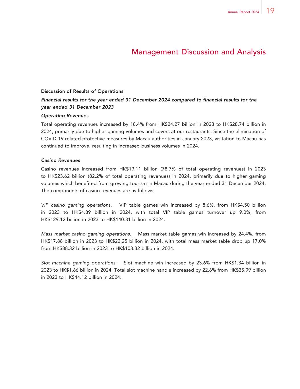 19Annual Report 2024 Management Discussion and Analysis Discussion of Results of Operations Financial results for the year ended 31 December 2024 compared to financial results for the year ended 31 December 2023 Operating Revenues Total operating revenues increased by 18.4% from HK$24.27 billion in 2023 to HK$28.74 billion in 2024, primarily due to higher gaming volumes and covers at our restaurants. Since the elimination of COVID-19 related protective measures by Macau authorities in January 2023, visitation to Macau has continued to improve, resulting in increased business volumes in 2024. Casino Revenues Casino revenues increased from HK$19.11 billion (78.7% of total operating revenues) in 2023 to HK$23.62 billion (82.2% of total operating revenues) in 2024, primarily due to higher gaming volumes which benefited from growing tourism in Macau during the year ended 31 December 2024. The components of casino revenues are as follows: VIP casino gaming operations. VIP table games win increased by 8.6%, from HK$4.50 billion in 2023 to HK$4.89 billion in 2024, with total VIP table games turnover up 9.0%, from HK$129.12 billion in 2023 to HK$140.81 billion in 2024. Mass market casino gaming operations. Mass market table games win increased by 24.4%, from HK$17.88 billion in 2023 to HK$22.25 billion in 2024, with total mass market table drop up 17.0% from HK$88.32 billion in 2023 to HK$103.32 billion in 2024. Slot machine gaming operations. Slot machine win increased by 23.6% from HK$1.34 billion in 2023 to HK$1.66 billion in 2024. Total slot machine handle increased by 22.6% from HK$35.99 billion in 2023 to HK$44.12 billion in 2024.