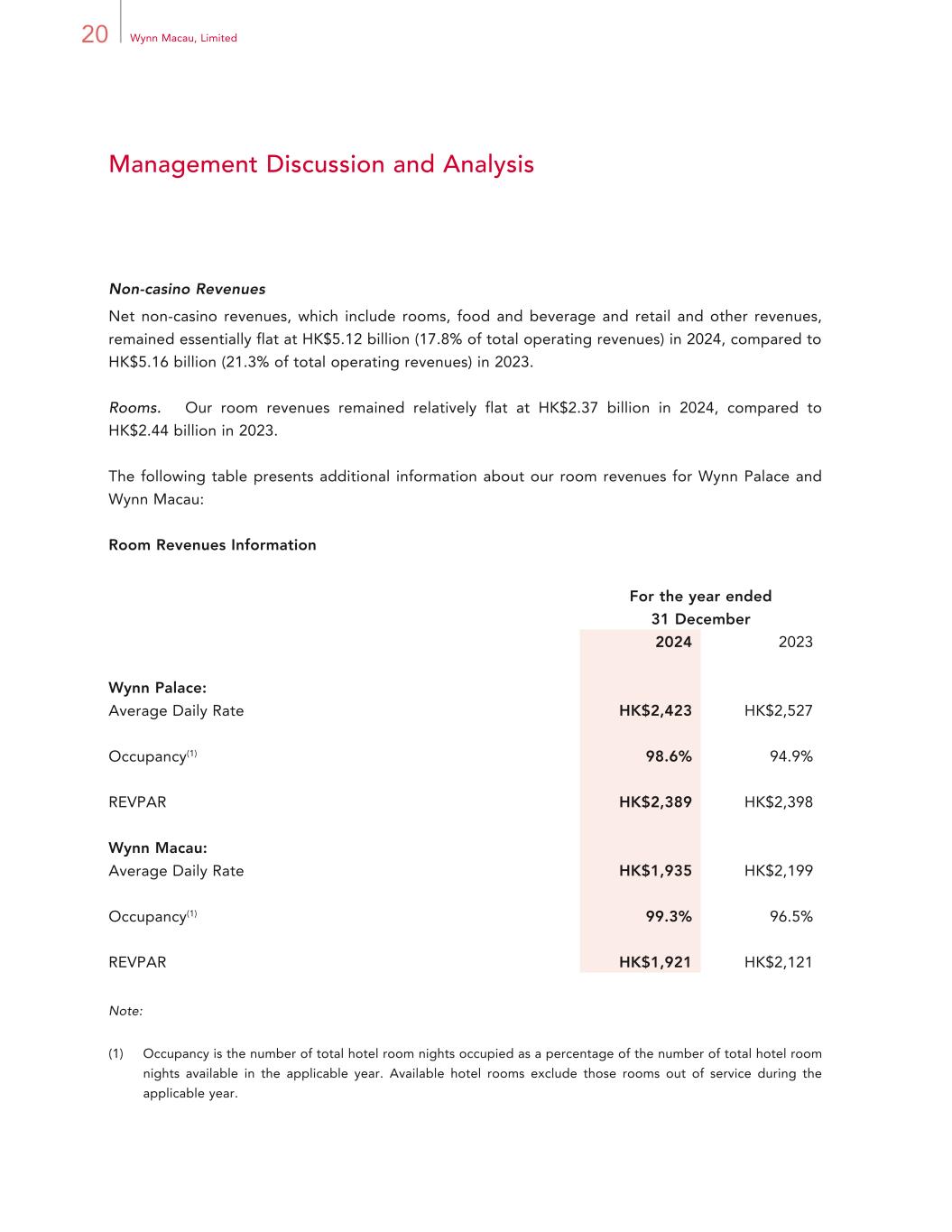 20 Wynn Macau, Limited Management Discussion and Analysis Non-casino Revenues Net non-casino revenues, which include rooms, food and beverage and retail and other revenues, remained essentially flat at HK$5.12 billion (17.8% of total operating revenues) in 2024, compared to HK$5.16 billion (21.3% of total operating revenues) in 2023. Rooms. Our room revenues remained relatively flat at HK$2.37 billion in 2024, compared to HK$2.44 billion in 2023. The following table presents additional information about our room revenues for Wynn Palace and Wynn Macau: Room Revenues Information For the year ended 31 December 2024 2023 Wynn Palace: Average Daily Rate HK$2,423 HK$2,527 Occupancy(1) 98.6% 94.9% REVPAR HK$2,389 HK$2,398 Wynn Macau: Average Daily Rate HK$1,935 HK$2,199 Occupancy(1) 99.3% 96.5% REVPAR HK$1,921 HK$2,121 Note: (1) Occupancy is the number of total hotel room nights occupied as a percentage of the number of total hotel room nights available in the applicable year. Available hotel rooms exclude those rooms out of service during the applicable year.