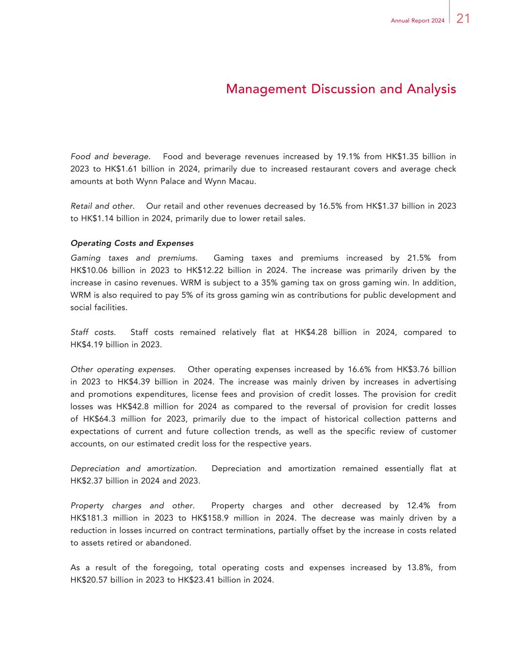 21Annual Report 2024 Management Discussion and Analysis Food and beverage. Food and beverage revenues increased by 19.1% from HK$1.35 billion in 2023 to HK$1.61 billion in 2024, primarily due to increased restaurant covers and average check amounts at both Wynn Palace and Wynn Macau. Retail and other. Our retail and other revenues decreased by 16.5% from HK$1.37 billion in 2023 to HK$1.14 billion in 2024, primarily due to lower retail sales. Operating Costs and Expenses Gaming taxes and premiums. Gaming taxes and premiums increased by 21.5% from HK$10.06 billion in 2023 to HK$12.22 billion in 2024. The increase was primarily driven by the increase in casino revenues. WRM is subject to a 35% gaming tax on gross gaming win. In addition, WRM is also required to pay 5% of its gross gaming win as contributions for public development and social facilities. Staff costs. Staff costs remained relatively flat at HK$4.28 billion in 2024, compared to HK$4.19 billion in 2023. Other operating expenses. Other operating expenses increased by 16.6% from HK$3.76 billion in 2023 to HK$4.39 billion in 2024. The increase was mainly driven by increases in advertising and promotions expenditures, license fees and provision of credit losses. The provision for credit losses was HK$42.8 million for 2024 as compared to the reversal of provision for credit losses of HK$64.3 million for 2023, primarily due to the impact of historical collection patterns and expectations of current and future collection trends, as well as the specific review of customer accounts, on our estimated credit loss for the respective years. Depreciation and amortization. Depreciation and amortization remained essentially flat at HK$2.37 billion in 2024 and 2023. Property charges and other. Property charges and other decreased by 12.4% from HK$181.3 million in 2023 to HK$158.9 million in 2024. The decrease was mainly driven by a reduction in losses incurred on contract terminations, partially offset by the increase in costs related to assets retired or abandoned. As a result of the foregoing, total operating costs and expenses increased by 13.8%, from HK$20.57 billion in 2023 to HK$23.41 billion in 2024.