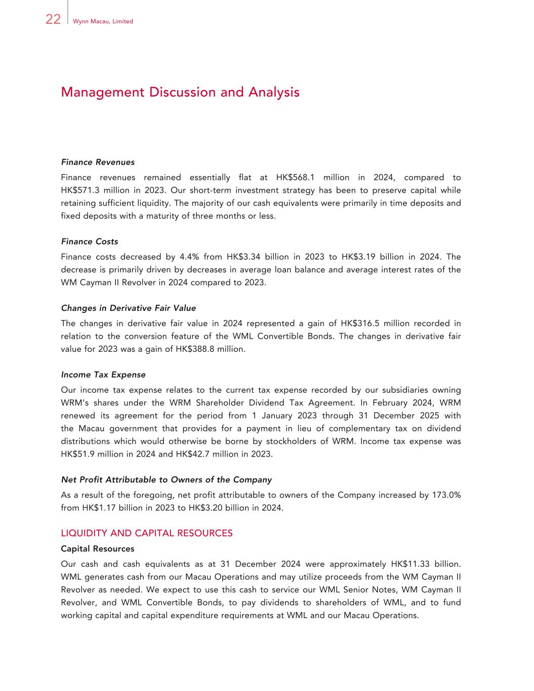 22 Wynn Macau, Limited Management Discussion and Analysis Finance Revenues Finance revenues remained essentially flat at HK$568.1 million in 2024, compared to HK$571.3 million in 2023. Our short-term investment strategy has been to preserve capital while retaining sufficient liquidity. The majority of our cash equivalents were primarily in time deposits and fixed deposits with a maturity of three months or less. Finance Costs Finance costs decreased by 4.4% from HK$3.34 billion in 2023 to HK$3.19 billion in 2024. The decrease is primarily driven by decreases in average loan balance and average interest rates of the WM Cayman II Revolver in 2024 compared to 2023. Changes in Derivative Fair Value The changes in derivative fair value in 2024 represented a gain of HK$316.5 million recorded in relation to the conversion feature of the WML Convertible Bonds. The changes in derivative fair value for 2023 was a gain of HK$388.8 million. Income Tax Expense Our income tax expense relates to the current tax expense recorded by our subsidiaries owning WRM’s shares under the WRM Shareholder Dividend Tax Agreement. In February 2024, WRM renewed its agreement for the period from 1 January 2023 through 31 December 2025 with the Macau government that provides for a payment in lieu of complementary tax on dividend distributions which would otherwise be borne by stockholders of WRM. Income tax expense was HK$51.9 million in 2024 and HK$42.7 million in 2023. Net Profit Attributable to Owners of the Company As a result of the foregoing, net profit attributable to owners of the Company increased by 173.0% from HK$1.17 billion in 2023 to HK$3.20 billion in 2024. LIQUIDITY AND CAPITAL RESOURCES Capital Resources Our cash and cash equivalents as at 31 December 2024 were approximately HK$11.33 billion. WML generates cash from our Macau Operations and may utilize proceeds from the WM Cayman II Revolver as needed. We expect to use this cash to service our WML Senior Notes, WM Cayman II Revolver, and WML Convertible Bonds, to pay dividends to shareholders of WML, and to fund working capital and capital expenditure requirements at WML and our Macau Operations.
