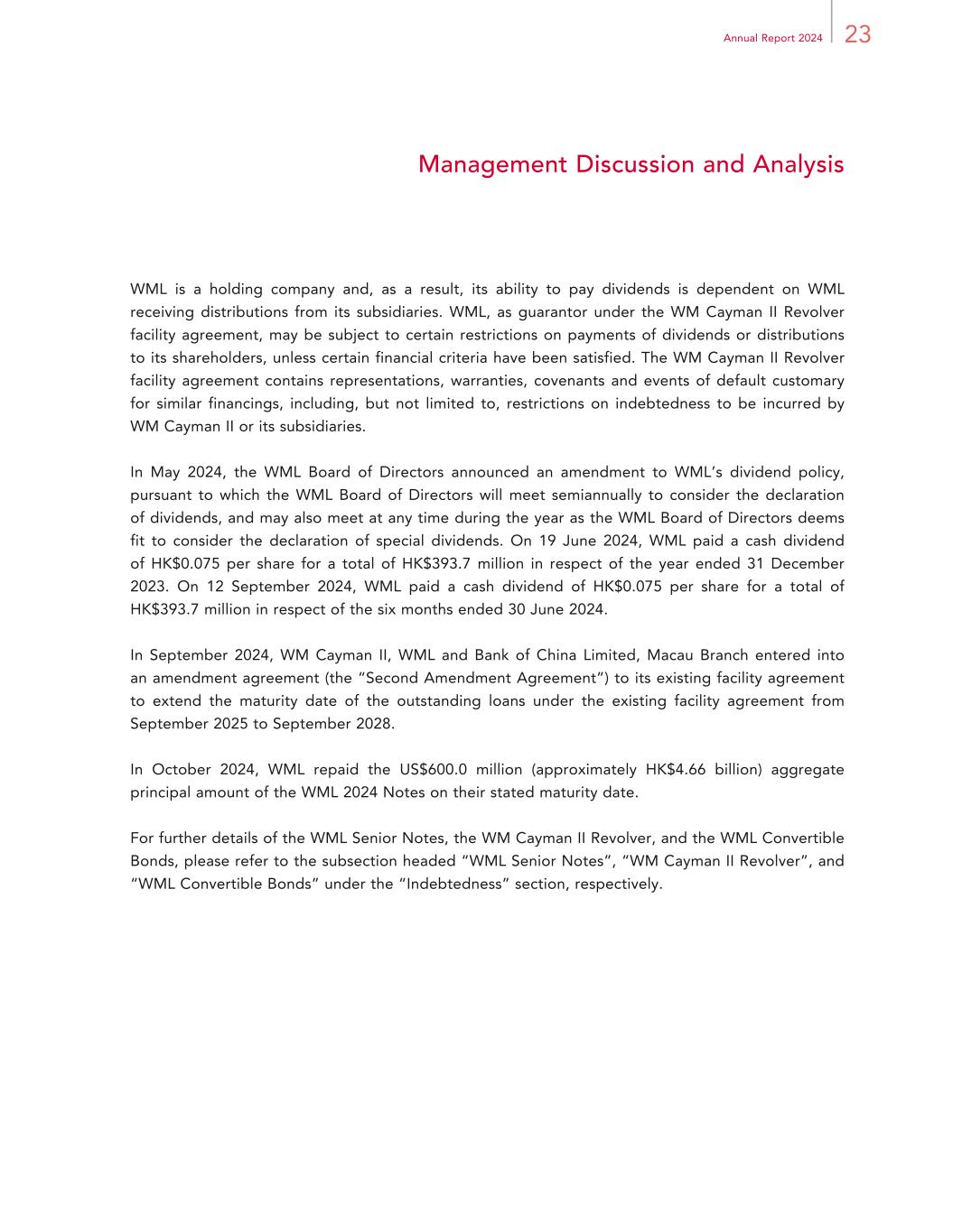 23Annual Report 2024 Management Discussion and Analysis WML is a holding company and, as a result, its ability to pay dividends is dependent on WML receiving distributions from its subsidiaries. WML, as guarantor under the WM Cayman II Revolver facility agreement, may be subject to certain restrictions on payments of dividends or distributions to its shareholders, unless certain financial criteria have been satisfied. The WM Cayman II Revolver facility agreement contains representations, warranties, covenants and events of default customary for similar financings, including, but not limited to, restrictions on indebtedness to be incurred by WM Cayman II or its subsidiaries. In May 2024, the WML Board of Directors announced an amendment to WML’s dividend policy, pursuant to which the WML Board of Directors will meet semiannually to consider the declaration of dividends, and may also meet at any time during the year as the WML Board of Directors deems fit to consider the declaration of special dividends. On 19 June 2024, WML paid a cash dividend of HK$0.075 per share for a total of HK$393.7 million in respect of the year ended 31 December 2023. On 12 September 2024, WML paid a cash dividend of HK$0.075 per share for a total of HK$393.7 million in respect of the six months ended 30 June 2024. In September 2024, WM Cayman II, WML and Bank of China Limited, Macau Branch entered into an amendment agreement (the “Second Amendment Agreement”) to its existing facility agreement to extend the maturity date of the outstanding loans under the existing facility agreement from September 2025 to September 2028. In October 2024, WML repaid the US$600.0 million (approximately HK$4.66 billion) aggregate principal amount of the WML 2024 Notes on their stated maturity date. For further details of the WML Senior Notes, the WM Cayman II Revolver, and the WML Convertible Bonds, please refer to the subsection headed “WML Senior Notes”, “WM Cayman II Revolver”, and “WML Convertible Bonds” under the “Indebtedness” section, respectively.