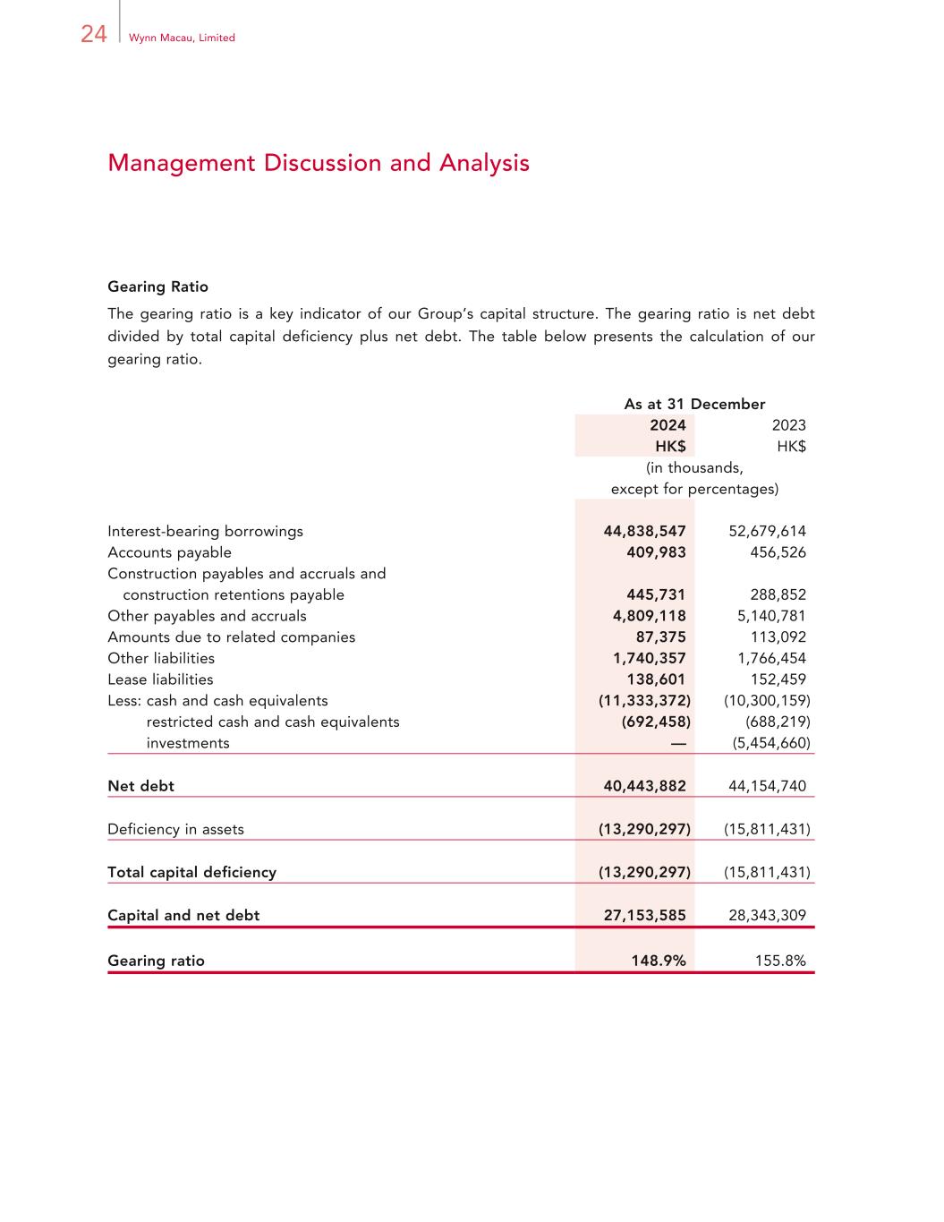 24 Wynn Macau, Limited Management Discussion and Analysis Gearing Ratio The gearing ratio is a key indicator of our Group’s capital structure. The gearing ratio is net debt divided by total capital deficiency plus net debt. The table below presents the calculation of our gearing ratio. As at 31 December 2024 2023 HK$ HK$ (in thousands, except for percentages) Interest-bearing borrowings 44,838,547 52,679,614 Accounts payable 409,983 456,526 Construction payables and accruals and construction retentions payable 445,731 288,852 Other payables and accruals 4,809,118 5,140,781 Amounts due to related companies 87,375 113,092 Other liabilities 1,740,357 1,766,454 Lease liabilities 138,601 152,459 Less: cash and cash equivalents (11,333,372) (10,300,159) restricted cash and cash equivalents (692,458) (688,219) investments — (5,454,660) Net debt 40,443,882 44,154,740 Deficiency in assets (13,290,297) (15,811,431) Total capital deficiency (13,290,297) (15,811,431) Capital and net debt 27,153,585 28,343,309 Gearing ratio 148.9% 155.8%