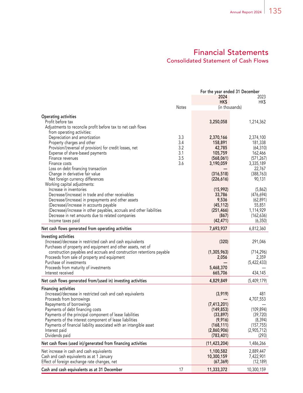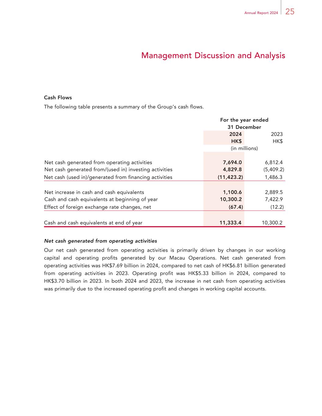 25Annual Report 2024 Management Discussion and Analysis Cash Flows The following table presents a summary of the Group’s cash flows. For the year ended 31 December 2024 2023 HK$ HK$ (in millions) Net cash generated from operating activities 7,694.0 6,812.4 Net cash generated from/(used in) investing activities 4,829.8 (5,409.2) Net cash (used in)/generated from financing activities (11,423.2) 1,486.3 Net increase in cash and cash equivalents 1,100.6 2,889.5 Cash and cash equivalents at beginning of year 10,300.2 7,422.9 Effect of foreign exchange rate changes, net (67.4) (12.2) Cash and cash equivalents at end of year 11,333.4 10,300.2 Net cash generated from operating activities Our net cash generated from operating activities is primarily driven by changes in our working capital and operating profits generated by our Macau Operations. Net cash generated from operating activities was HK$7.69 billion in 2024, compared to net cash of HK$6.81 billion generated from operating activities in 2023. Operating profit was HK$5.33 billion in 2024, compared to HK$3.70 billion in 2023. In both 2024 and 2023, the increase in net cash from operating activities was primarily due to the increased operating profit and changes in working capital accounts.