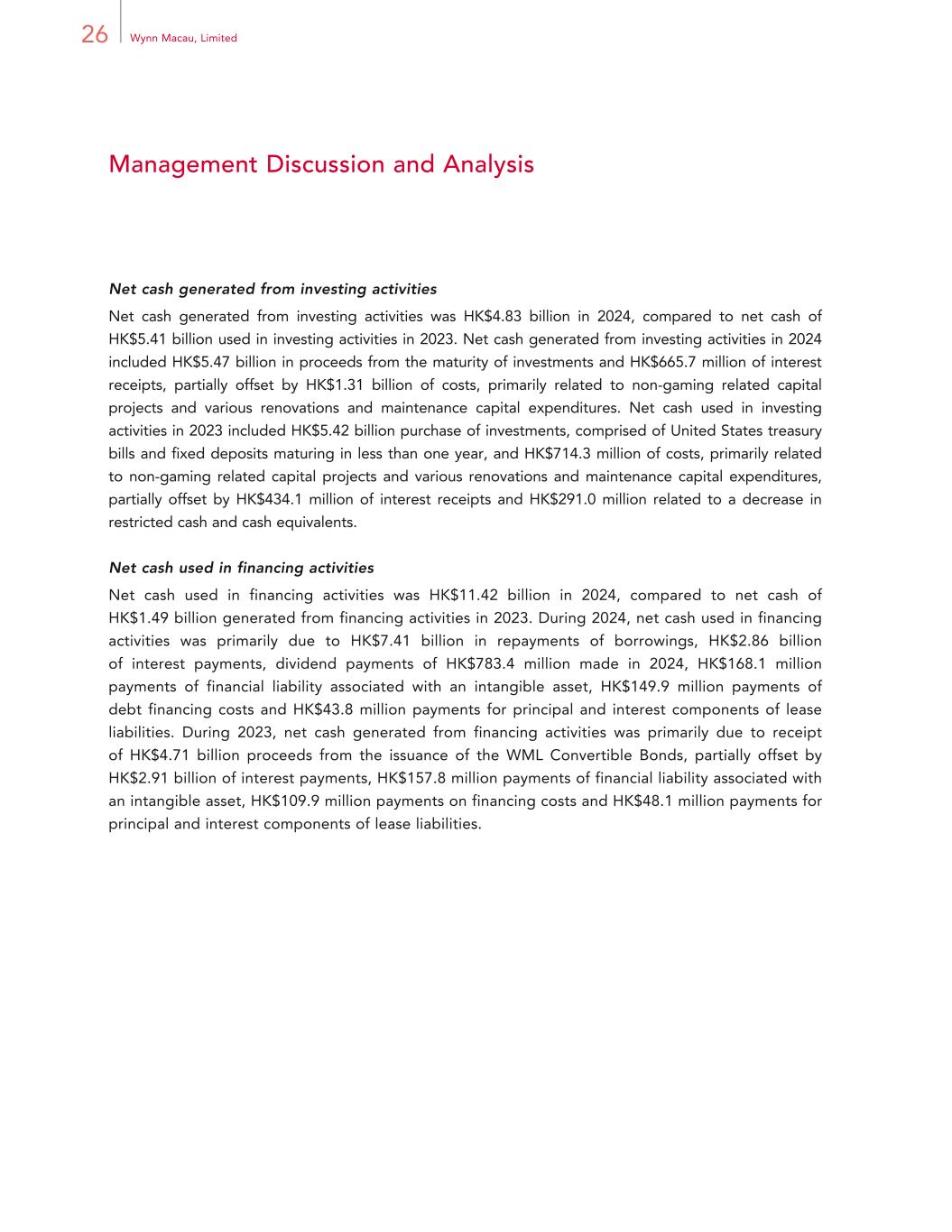 26 Wynn Macau, Limited Management Discussion and Analysis Net cash generated from investing activities Net cash generated from investing activities was HK$4.83 billion in 2024, compared to net cash of HK$5.41 billion used in investing activities in 2023. Net cash generated from investing activities in 2024 included HK$5.47 billion in proceeds from the maturity of investments and HK$665.7 million of interest receipts, partially offset by HK$1.31 billion of costs, primarily related to non-gaming related capital projects and various renovations and maintenance capital expenditures. Net cash used in investing activities in 2023 included HK$5.42 billion purchase of investments, comprised of United States treasury bills and fixed deposits maturing in less than one year, and HK$714.3 million of costs, primarily related to non-gaming related capital projects and various renovations and maintenance capital expenditures, partially offset by HK$434.1 million of interest receipts and HK$291.0 million related to a decrease in restricted cash and cash equivalents. Net cash used in financing activities Net cash used in financing activities was HK$11.42 billion in 2024, compared to net cash of HK$1.49 billion generated from financing activities in 2023. During 2024, net cash used in financing activities was primarily due to HK$7.41 billion in repayments of borrowings, HK$2.86 billion of interest payments, dividend payments of HK$783.4 million made in 2024, HK$168.1 million payments of financial liability associated with an intangible asset, HK$149.9 million payments of debt financing costs and HK$43.8 million payments for principal and interest components of lease liabilities. During 2023, net cash generated from financing activities was primarily due to receipt of HK$4.71 billion proceeds from the issuance of the WML Convertible Bonds, partially offset by HK$2.91 billion of interest payments, HK$157.8 million payments of financial liability associated with an intangible asset, HK$109.9 million payments on financing costs and HK$48.1 million payments for principal and interest components of lease liabilities.