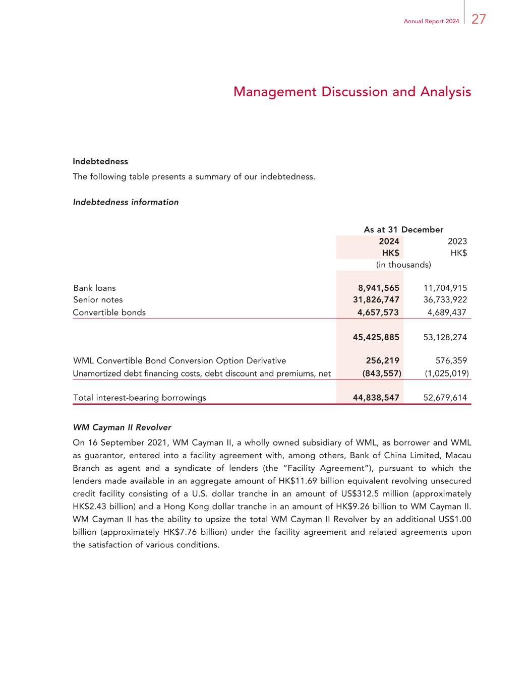 27Annual Report 2024 Management Discussion and Analysis Indebtedness The following table presents a summary of our indebtedness. Indebtedness information As at 31 December 2024 2023 HK$ HK$ (in thousands) Bank loans 8,941,565 11,704,915 Senior notes 31,826,747 36,733,922 Convertible bonds 4,657,573 4,689,437 45,425,885 53,128,274 WML Convertible Bond Conversion Option Derivative 256,219 576,359 Unamortized debt financing costs, debt discount and premiums, net (843,557) (1,025,019) Total interest-bearing borrowings 44,838,547 52,679,614 WM Cayman II Revolver On 16 September 2021, WM Cayman II, a wholly owned subsidiary of WML, as borrower and WML as guarantor, entered into a facility agreement with, among others, Bank of China Limited, Macau Branch as agent and a syndicate of lenders (the “Facility Agreement”), pursuant to which the lenders made available in an aggregate amount of HK$11.69 billion equivalent revolving unsecured credit facility consisting of a U.S. dollar tranche in an amount of US$312.5 million (approximately HK$2.43 billion) and a Hong Kong dollar tranche in an amount of HK$9.26 billion to WM Cayman II. WM Cayman II has the ability to upsize the total WM Cayman II Revolver by an additional US$1.00 billion (approximately HK$7.76 billion) under the facility agreement and related agreements upon the satisfaction of various conditions.