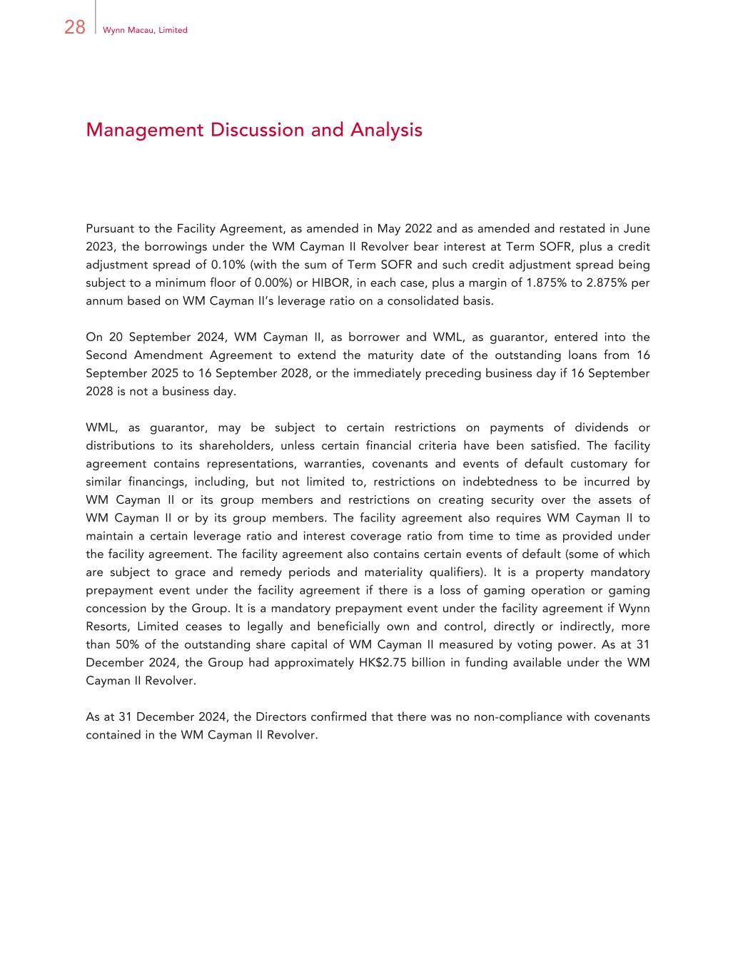 28 Wynn Macau, Limited Management Discussion and Analysis Pursuant to the Facility Agreement, as amended in May 2022 and as amended and restated in June 2023, the borrowings under the WM Cayman II Revolver bear interest at Term SOFR, plus a credit adjustment spread of 0.10% (with the sum of Term SOFR and such credit adjustment spread being subject to a minimum floor of 0.00%) or HIBOR, in each case, plus a margin of 1.875% to 2.875% per annum based on WM Cayman II’s leverage ratio on a consolidated basis. On 20 September 2024, WM Cayman II, as borrower and WML, as guarantor, entered into the Second Amendment Agreement to extend the maturity date of the outstanding loans from 16 September 2025 to 16 September 2028, or the immediately preceding business day if 16 September 2028 is not a business day. WML, as guarantor, may be subject to certain restrictions on payments of dividends or distributions to its shareholders, unless certain financial criteria have been satisfied. The facility agreement contains representations, warranties, covenants and events of default customary for similar financings, including, but not limited to, restrictions on indebtedness to be incurred by WM Cayman II or its group members and restrictions on creating security over the assets of WM Cayman II or by its group members. The facility agreement also requires WM Cayman II to maintain a certain leverage ratio and interest coverage ratio from time to time as provided under the facility agreement. The facility agreement also contains certain events of default (some of which are subject to grace and remedy periods and materiality qualifiers). It is a property mandatory prepayment event under the facility agreement if there is a loss of gaming operation or gaming concession by the Group. It is a mandatory prepayment event under the facility agreement if Wynn Resorts, Limited ceases to legally and beneficially own and control, directly or indirectly, more than 50% of the outstanding share capital of WM Cayman II measured by voting power. As at 31 December 2024, the Group had approximately HK$2.75 billion in funding available under the WM Cayman II Revolver. As at 31 December 2024, the Directors confirmed that there was no non-compliance with covenants contained in the WM Cayman II Revolver.