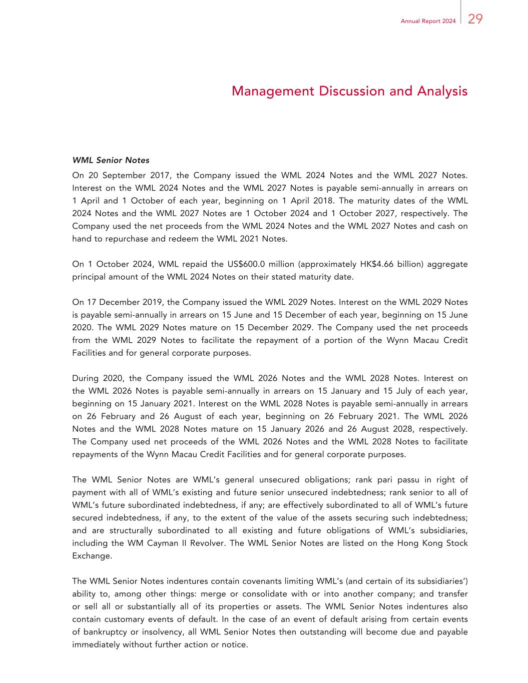 29Annual Report 2024 Management Discussion and Analysis WML Senior Notes On 20 September 2017, the Company issued the WML 2024 Notes and the WML 2027 Notes. Interest on the WML 2024 Notes and the WML 2027 Notes is payable semi-annually in arrears on 1 April and 1 October of each year, beginning on 1 April 2018. The maturity dates of the WML 2024 Notes and the WML 2027 Notes are 1 October 2024 and 1 October 2027, respectively. The Company used the net proceeds from the WML 2024 Notes and the WML 2027 Notes and cash on hand to repurchase and redeem the WML 2021 Notes. On 1 October 2024, WML repaid the US$600.0 million (approximately HK$4.66 billion) aggregate principal amount of the WML 2024 Notes on their stated maturity date. On 17 December 2019, the Company issued the WML 2029 Notes. Interest on the WML 2029 Notes is payable semi-annually in arrears on 15 June and 15 December of each year, beginning on 15 June 2020. The WML 2029 Notes mature on 15 December 2029. The Company used the net proceeds from the WML 2029 Notes to facilitate the repayment of a portion of the Wynn Macau Credit Facilities and for general corporate purposes. During 2020, the Company issued the WML 2026 Notes and the WML 2028 Notes. Interest on the WML 2026 Notes is payable semi-annually in arrears on 15 January and 15 July of each year, beginning on 15 January 2021. Interest on the WML 2028 Notes is payable semi-annually in arrears on 26 February and 26 August of each year, beginning on 26 February 2021. The WML 2026 Notes and the WML 2028 Notes mature on 15 January 2026 and 26 August 2028, respectively. The Company used net proceeds of the WML 2026 Notes and the WML 2028 Notes to facilitate repayments of the Wynn Macau Credit Facilities and for general corporate purposes. The WML Senior Notes are WML’s general unsecured obligations; rank pari passu in right of payment with all of WML’s existing and future senior unsecured indebtedness; rank senior to all of WML’s future subordinated indebtedness, if any; are effectively subordinated to all of WML’s future secured indebtedness, if any, to the extent of the value of the assets securing such indebtedness; and are structurally subordinated to all existing and future obligations of WML’s subsidiaries, including the WM Cayman II Revolver. The WML Senior Notes are listed on the Hong Kong Stock Exchange. The WML Senior Notes indentures contain covenants limiting WML’s (and certain of its subsidiaries’) ability to, among other things: merge or consolidate with or into another company; and transfer or sell all or substantially all of its properties or assets. The WML Senior Notes indentures also contain customary events of default. In the case of an event of default arising from certain events of bankruptcy or insolvency, all WML Senior Notes then outstanding will become due and payable immediately without further action or notice.