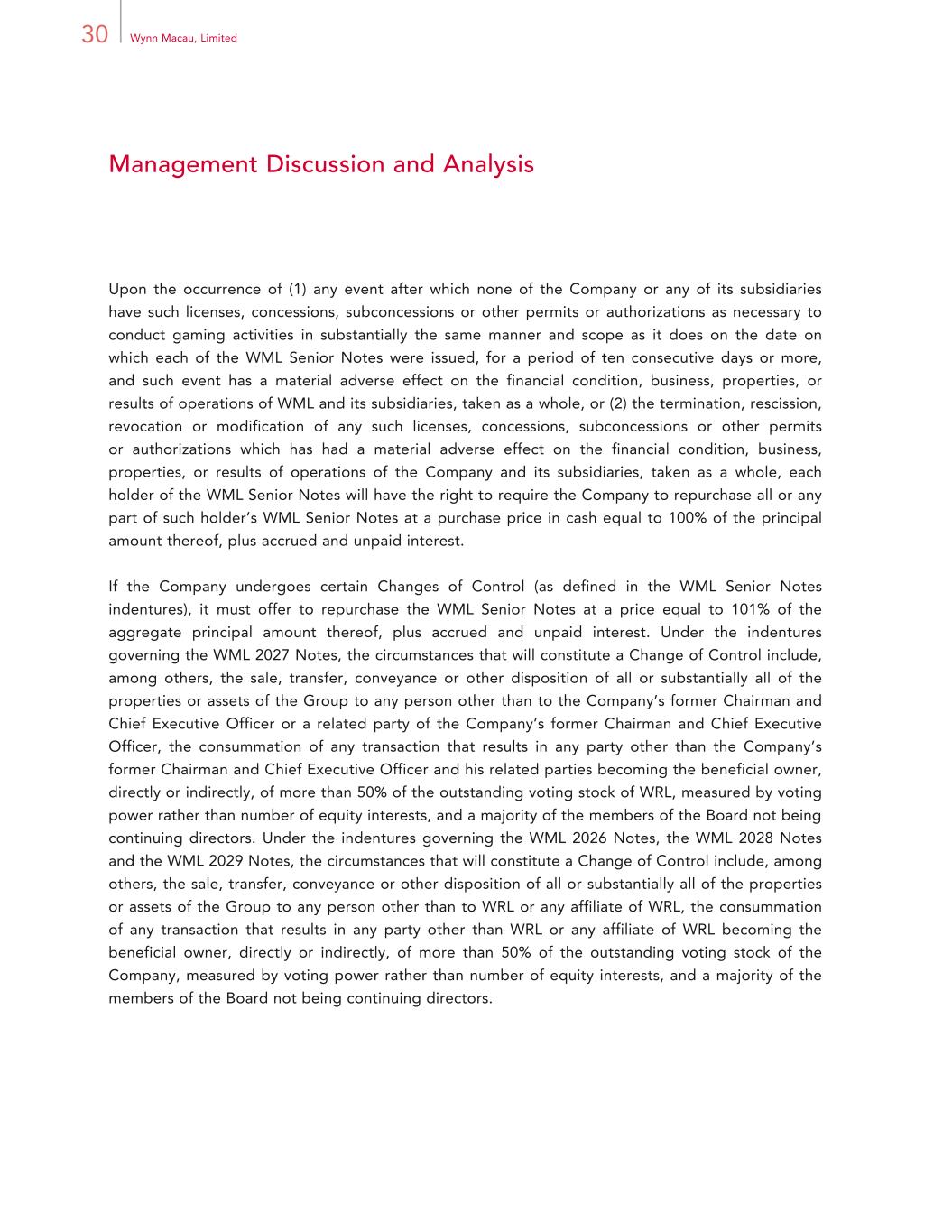30 Wynn Macau, Limited Management Discussion and Analysis Upon the occurrence of (1) any event after which none of the Company or any of its subsidiaries have such licenses, concessions, subconcessions or other permits or authorizations as necessary to conduct gaming activities in substantially the same manner and scope as it does on the date on which each of the WML Senior Notes were issued, for a period of ten consecutive days or more, and such event has a material adverse effect on the financial condition, business, properties, or results of operations of WML and its subsidiaries, taken as a whole, or (2) the termination, rescission, revocation or modification of any such licenses, concessions, subconcessions or other permits or authorizations which has had a material adverse effect on the financial condition, business, properties, or results of operations of the Company and its subsidiaries, taken as a whole, each holder of the WML Senior Notes will have the right to require the Company to repurchase all or any part of such holder’s WML Senior Notes at a purchase price in cash equal to 100% of the principal amount thereof, plus accrued and unpaid interest. If the Company undergoes certain Changes of Control (as defined in the WML Senior Notes indentures), it must offer to repurchase the WML Senior Notes at a price equal to 101% of the aggregate principal amount thereof, plus accrued and unpaid interest. Under the indentures governing the WML 2027 Notes, the circumstances that will constitute a Change of Control include, among others, the sale, transfer, conveyance or other disposition of all or substantially all of the properties or assets of the Group to any person other than to the Company’s former Chairman and Chief Executive Officer or a related party of the Company’s former Chairman and Chief Executive Officer, the consummation of any transaction that results in any party other than the Company’s former Chairman and Chief Executive Officer and his related parties becoming the beneficial owner, directly or indirectly, of more than 50% of the outstanding voting stock of WRL, measured by voting power rather than number of equity interests, and a majority of the members of the Board not being continuing directors. Under the indentures governing the WML 2026 Notes, the WML 2028 Notes and the WML 2029 Notes, the circumstances that will constitute a Change of Control include, among others, the sale, transfer, conveyance or other disposition of all or substantially all of the properties or assets of the Group to any person other than to WRL or any affiliate of WRL, the consummation of any transaction that results in any party other than WRL or any affiliate of WRL becoming the beneficial owner, directly or indirectly, of more than 50% of the outstanding voting stock of the Company, measured by voting power rather than number of equity interests, and a majority of the members of the Board not being continuing directors.