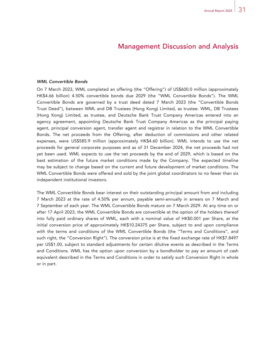 31Annual Report 2024 Management Discussion and Analysis WML Convertible Bonds On 7 March 2023, WML completed an offering (the “Offering”) of US$600.0 million (approximately HK$4.66 billion) 4.50% convertible bonds due 2029 (the “WML Convertible Bonds”). The WML Convertible Bonds are governed by a trust deed dated 7 March 2023 (the “Convertible Bonds Trust Deed”), between WML and DB Trustees (Hong Kong) Limited, as trustee. WML, DB Trustees (Hong Kong) Limited, as trustee, and Deutsche Bank Trust Company Americas entered into an agency agreement, appointing Deutsche Bank Trust Company Americas as the principal paying agent, principal conversion agent, transfer agent and registrar in relation to the WML Convertible Bonds. The net proceeds from the Offering, after deduction of commissions and other related expenses, were US$585.9 million (approximately HK$4.60 billion). WML intends to use the net proceeds for general corporate purposes and as of 31 December 2024, the net proceeds had not yet been used. WML expects to use the net proceeds by the end of 2029, which is based on the best estimation of the future market conditions made by the Company. The expected timeline may be subject to change based on the current and future development of market conditions. The WML Convertible Bonds were offered and sold by the joint global coordinators to no fewer than six independent institutional investors. The WML Convertible Bonds bear interest on their outstanding principal amount from and including 7 March 2023 at the rate of 4.50% per annum, payable semi-annually in arrears on 7 March and 7 September of each year. The WML Convertible Bonds mature on 7 March 2029. At any time on or after 17 April 2023, the WML Convertible Bonds are convertible at the option of the holders thereof into fully paid ordinary shares of WML, each with a nominal value of HK$0.001 per Share, at the initial conversion price of approximately HK$10.24375 per Share, subject to and upon compliance with the terms and conditions of the WML Convertible Bonds (the “Terms and Conditions”, and such right, the “Conversion Right”). The conversion price is at the fixed exchange rate of HK$7.8497 per US$1.00, subject to standard adjustments for certain dilutive events as described in the Terms and Conditions. WML has the option upon conversion by a bondholder to pay an amount of cash equivalent described in the Terms and Conditions in order to satisfy such Conversion Right in whole or in part.