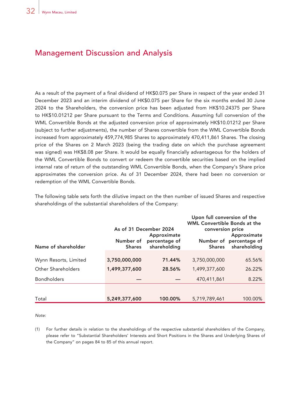 32 Wynn Macau, Limited Management Discussion and Analysis As a result of the payment of a final dividend of HK$0.075 per Share in respect of the year ended 31 December 2023 and an interim dividend of HK$0.075 per Share for the six months ended 30 June 2024 to the Shareholders, the conversion price has been adjusted from HK$10.24375 per Share to HK$10.01212 per Share pursuant to the Terms and Conditions. Assuming full conversion of the WML Convertible Bonds at the adjusted conversion price of approximately HK$10.01212 per Share (subject to further adjustments), the number of Shares convertible from the WML Convertible Bonds increased from approximately 459,774,985 Shares to approximately 470,411,861 Shares. The closing price of the Shares on 2 March 2023 (being the trading date on which the purchase agreement was signed) was HK$8.08 per Share. It would be equally financially advantageous for the holders of the WML Convertible Bonds to convert or redeem the convertible securities based on the implied internal rate of return of the outstanding WML Convertible Bonds, when the Company’s Share price approximates the conversion price. As of 31 December 2024, there had been no conversion or redemption of the WML Convertible Bonds. The following table sets forth the dilutive impact on the then number of issued Shares and respective shareholdings of the substantial shareholders of the Company: Name of shareholder As of 31 December 2024 Upon full conversion of the WML Convertible Bonds at the conversion price Number of Shares Approximate percentage of shareholding Number of Shares Approximate percentage of shareholding Wynn Resorts, Limited 3,750,000,000 71.44% 3,750,000,000 65.56% Other Shareholders 1,499,377,600 28.56% 1,499,377,600 26.22% Bondholders — — 470,411,861 8.22% Total 5,249,377,600 100.00% 5,719,789,461 100.00% Note: (1) For further details in relation to the shareholdings of the respective substantial shareholders of the Company, please refer to “Substantial Shareholders’ Interests and Short Positions in the Shares and Underlying Shares of the Company” on pages 84 to 85 of this annual report.
