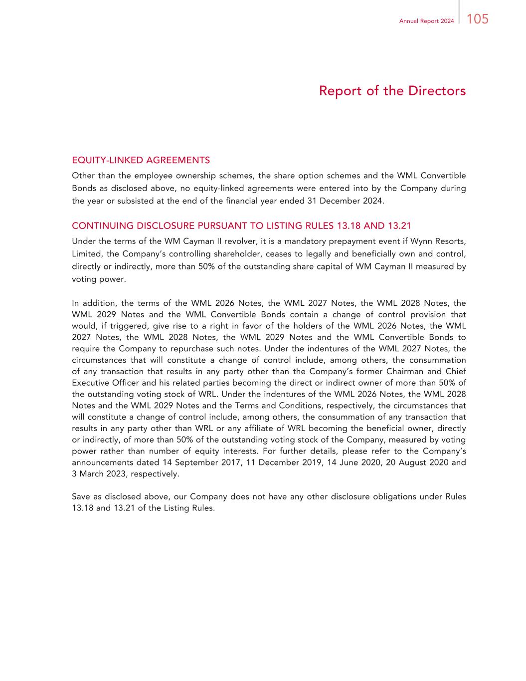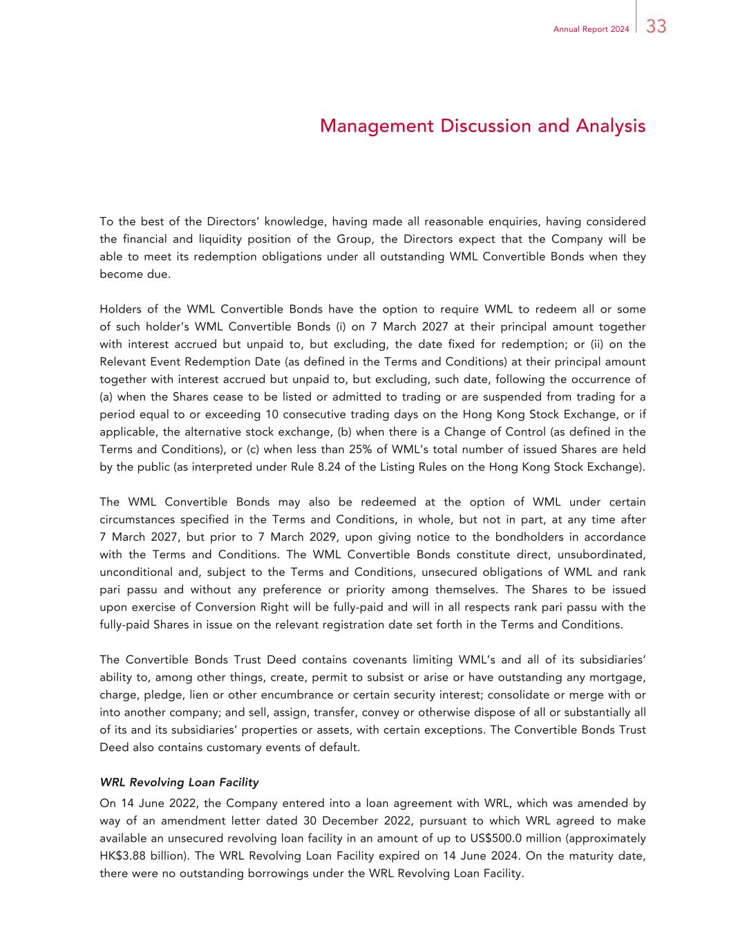 33Annual Report 2024 Management Discussion and Analysis To the best of the Directors’ knowledge, having made all reasonable enquiries, having considered the financial and liquidity position of the Group, the Directors expect that the Company will be able to meet its redemption obligations under all outstanding WML Convertible Bonds when they become due. Holders of the WML Convertible Bonds have the option to require WML to redeem all or some of such holder’s WML Convertible Bonds (i) on 7 March 2027 at their principal amount together with interest accrued but unpaid to, but excluding, the date fixed for redemption; or (ii) on the Relevant Event Redemption Date (as defined in the Terms and Conditions) at their principal amount together with interest accrued but unpaid to, but excluding, such date, following the occurrence of (a) when the Shares cease to be listed or admitted to trading or are suspended from trading for a period equal to or exceeding 10 consecutive trading days on the Hong Kong Stock Exchange, or if applicable, the alternative stock exchange, (b) when there is a Change of Control (as defined in the Terms and Conditions), or (c) when less than 25% of WML’s total number of issued Shares are held by the public (as interpreted under Rule 8.24 of the Listing Rules on the Hong Kong Stock Exchange). The WML Convertible Bonds may also be redeemed at the option of WML under certain circumstances specified in the Terms and Conditions, in whole, but not in part, at any time after 7 March 2027, but prior to 7 March 2029, upon giving notice to the bondholders in accordance with the Terms and Conditions. The WML Convertible Bonds constitute direct, unsubordinated, unconditional and, subject to the Terms and Conditions, unsecured obligations of WML and rank pari passu and without any preference or priority among themselves. The Shares to be issued upon exercise of Conversion Right will be fully-paid and will in all respects rank pari passu with the fully-paid Shares in issue on the relevant registration date set forth in the Terms and Conditions. The Convertible Bonds Trust Deed contains covenants limiting WML’s and all of its subsidiaries’ ability to, among other things, create, permit to subsist or arise or have outstanding any mortgage, charge, pledge, lien or other encumbrance or certain security interest; consolidate or merge with or into another company and sell, assign, transfer, convey or otherwise dispose of all or substantially all of its and its subsidiaries’ properties or assets, with certain exceptions. The Convertible Bonds Trust Deed also contains customary events of default. WRL Revolving Loan Facility On 14 June 2022, the Company entered into a loan agreement with WRL, which was amended by way of an amendment letter dated 30 December 2022, pursuant to which WRL agreed to make available an unsecured revolving loan facility in an amount of up to US$500.0 million (approximately HK$3.88 billion). The WRL Revolving Loan Facility expired on 14 June 2024. On the maturity date, there were no outstanding borrowings under the WRL Revolving Loan Facility.