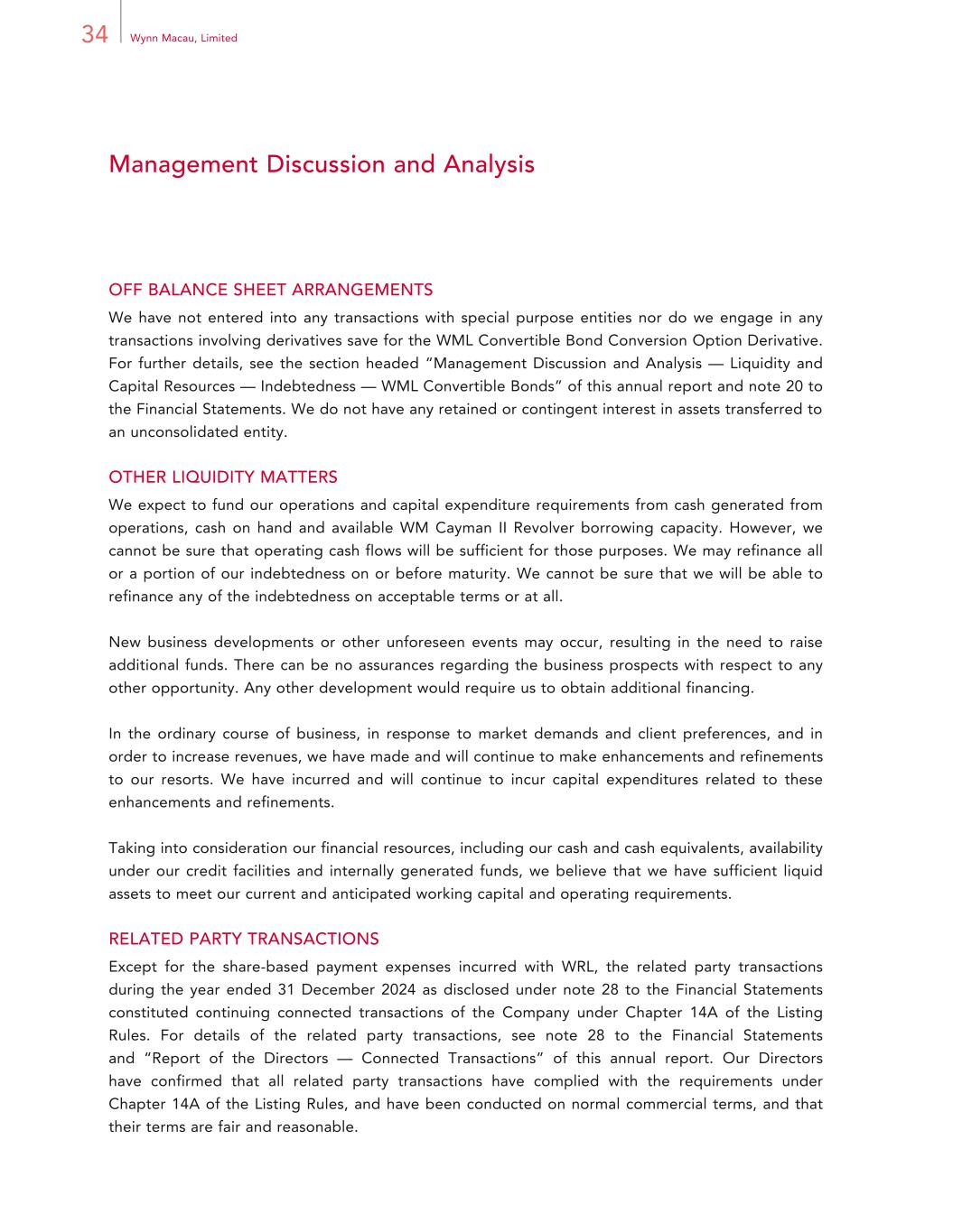 34 Wynn Macau, Limited Management Discussion and Analysis OFF BALANCE SHEET ARRANGEMENTS We have not entered into any transactions with special purpose entities nor do we engage in any transactions involving derivatives save for the WML Convertible Bond Conversion Option Derivative. For further details, see the section headed “Management Discussion and Analysis — Liquidity and Capital Resources — Indebtedness — WML Convertible Bonds” of this annual report and note 20 to the Financial Statements. We do not have any retained or contingent interest in assets transferred to an unconsolidated entity. OTHER LIQUIDITY MATTERS We expect to fund our operations and capital expenditure requirements from cash generated from operations, cash on hand and available WM Cayman II Revolver borrowing capacity. However, we cannot be sure that operating cash flows will be sufficient for those purposes. We may refinance all or a portion of our indebtedness on or before maturity. We cannot be sure that we will be able to refinance any of the indebtedness on acceptable terms or at all. New business developments or other unforeseen events may occur, resulting in the need to raise additional funds. There can be no assurances regarding the business prospects with respect to any other opportunity. Any other development would require us to obtain additional financing. In the ordinary course of business, in response to market demands and client preferences, and in order to increase revenues, we have made and will continue to make enhancements and refinements to our resorts. We have incurred and will continue to incur capital expenditures related to these enhancements and refinements. Taking into consideration our financial resources, including our cash and cash equivalents, availability under our credit facilities and internally generated funds, we believe that we have sufficient liquid assets to meet our current and anticipated working capital and operating requirements. RELATED PARTY TRANSACTIONS Except for the share-based payment expenses incurred with WRL, the related party transactions during the year ended 31 December 2024 as disclosed under note 28 to the Financial Statements constituted continuing connected transactions of the Company under Chapter 14A of the Listing Rules. For details of the related party transactions, see note 28 to the Financial Statements and “Report of the Directors — Connected Transactions” of this annual report. Our Directors have confirmed that all related party transactions have complied with the requirements under Chapter 14A of the Listing Rules, and have been conducted on normal commercial terms, and that their terms are fair and reasonable.