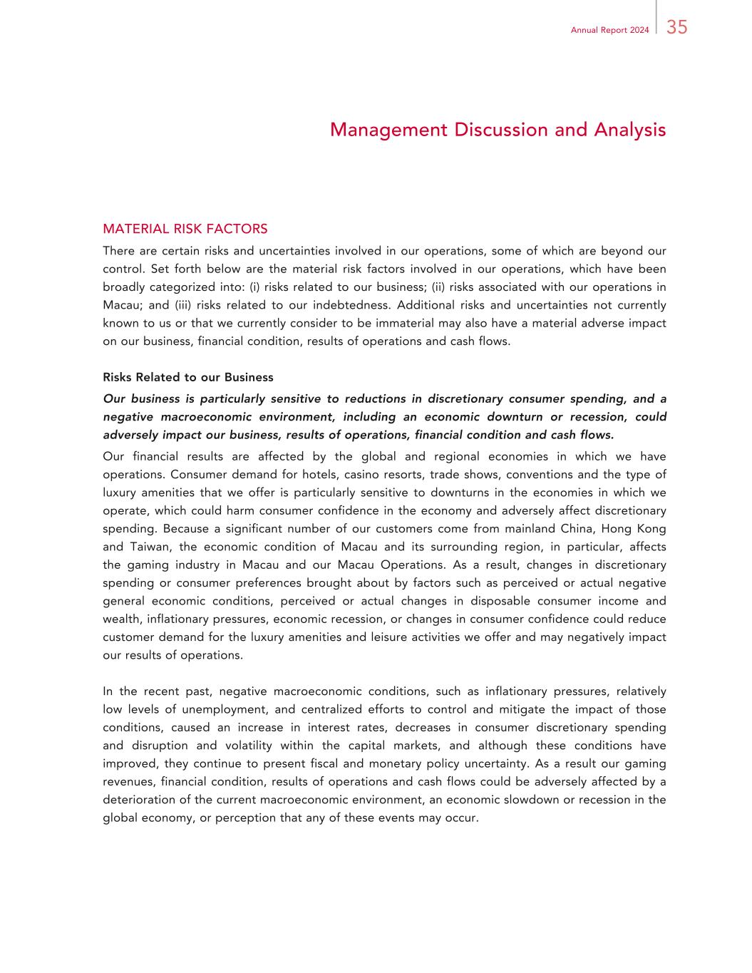 35Annual Report 2024 Management Discussion and Analysis MATERIAL RISK FACTORS There are certain risks and uncertainties involved in our operations, some of which are beyond our control. Set forth below are the material risk factors involved in our operations, which have been broadly categorized into: (i) risks related to our business; (ii) risks associated with our operations in Macau; and (iii) risks related to our indebtedness. Additional risks and uncertainties not currently known to us or that we currently consider to be immaterial may also have a material adverse impact on our business, financial condition, results of operations and cash flows. Risks Related to our Business Our business is particularly sensitive to reductions in discretionary consumer spending, and a negative macroeconomic environment, including an economic downturn or recession, could adversely impact our business, results of operations, financial condition and cash flows. Our financial results are affected by the global and regional economies in which we have operations. Consumer demand for hotels, casino resorts, trade shows, conventions and the type of luxury amenities that we offer is particularly sensitive to downturns in the economies in which we operate, which could harm consumer confidence in the economy and adversely affect discretionary spending. Because a significant number of our customers come from mainland China, Hong Kong and Taiwan, the economic condition of Macau and its surrounding region, in particular, affects the gaming industry in Macau and our Macau Operations. As a result, changes in discretionary spending or consumer preferences brought about by factors such as perceived or actual negative general economic conditions, perceived or actual changes in disposable consumer income and wealth, inflationary pressures, economic recession, or changes in consumer confidence could reduce customer demand for the luxury amenities and leisure activities we offer and may negatively impact our results of operations. In the recent past, negative macroeconomic conditions, such as inflationary pressures, relatively low levels of unemployment, and centralized efforts to control and mitigate the impact of those conditions, caused an increase in interest rates, decreases in consumer discretionary spending and disruption and volatility within the capital markets, and although these conditions have improved, they continue to present fiscal and monetary policy uncertainty. As a result our gaming revenues, financial condition, results of operations and cash flows could be adversely affected by a deterioration of the current macroeconomic environment, an economic slowdown or recession in the global economy, or perception that any of these events may occur.