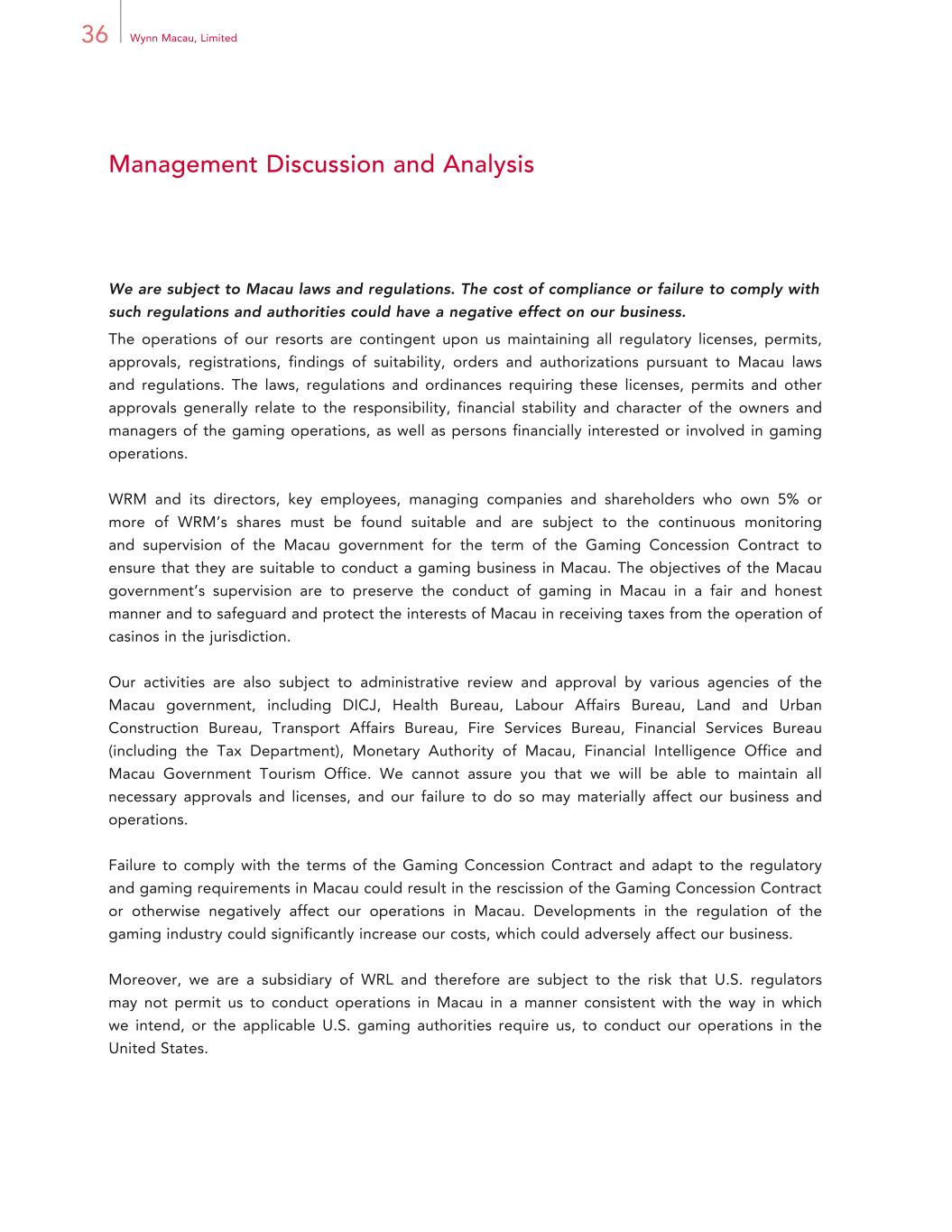 36 Wynn Macau, Limited Management Discussion and Analysis We are subject to Macau laws and regulations. The cost of compliance or failure to comply with such regulations and authorities could have a negative effect on our business. The operations of our resorts are contingent upon us maintaining all regulatory licenses, permits, approvals, registrations, findings of suitability, orders and authorizations pursuant to Macau laws and regulations. The laws, regulations and ordinances requiring these licenses, permits and other approvals generally relate to the responsibility, financial stability and character of the owners and managers of the gaming operations, as well as persons financially interested or involved in gaming operations. WRM and its directors, key employees, managing companies and shareholders who own 5% or more of WRM’s shares must be found suitable and are subject to the continuous monitoring and supervision of the Macau government for the term of the Gaming Concession Contract to ensure that they are suitable to conduct a gaming business in Macau. The objectives of the Macau government’s supervision are to preserve the conduct of gaming in Macau in a fair and honest manner and to safeguard and protect the interests of Macau in receiving taxes from the operation of casinos in the jurisdiction. Our activities are also subject to administrative review and approval by various agencies of the Macau government, including DICJ, Health Bureau, Labour Affairs Bureau, Land and Urban Construction Bureau, Transport Affairs Bureau, Fire Services Bureau, Financial Services Bureau (including the Tax Department), Monetary Authority of Macau, Financial Intelligence Office and Macau Government Tourism Office. We cannot assure you that we will be able to maintain all necessary approvals and licenses, and our failure to do so may materially affect our business and operations. Failure to comply with the terms of the Gaming Concession Contract and adapt to the regulatory and gaming requirements in Macau could result in the rescission of the Gaming Concession Contract or otherwise negatively affect our operations in Macau. Developments in the regulation of the gaming industry could significantly increase our costs, which could adversely affect our business. Moreover, we are a subsidiary of WRL and therefore are subject to the risk that U.S. regulators may not permit us to conduct operations in Macau in a manner consistent with the way in which we intend, or the applicable U.S. gaming authorities require us, to conduct our operations in the United States.