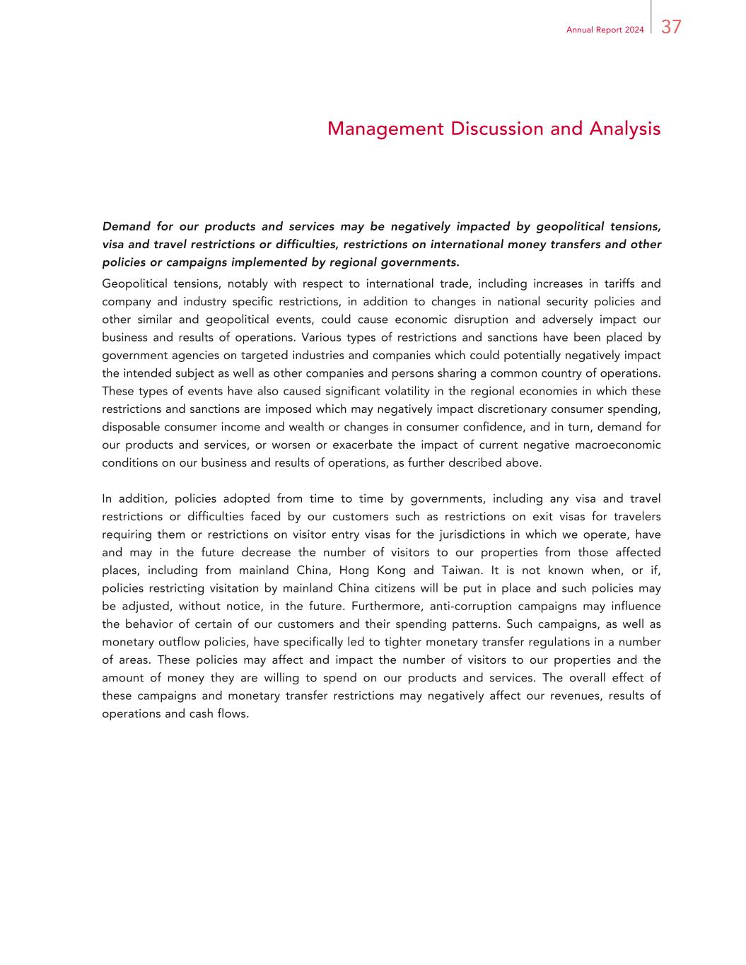 37Annual Report 2024 Management Discussion and Analysis Demand for our products and services may be negatively impacted by geopolitical tensions, visa and travel restrictions or difficulties, restrictions on international money transfers and other policies or campaigns implemented by regional governments. Geopolitical tensions, notably with respect to international trade, including increases in tariffs and company and industry specific restrictions, in addition to changes in national security policies and other similar and geopolitical events, could cause economic disruption and adversely impact our business and results of operations. Various types of restrictions and sanctions have been placed by government agencies on targeted industries and companies which could potentially negatively impact the intended subject as well as other companies and persons sharing a common country of operations. These types of events have also caused significant volatility in the regional economies in which these restrictions and sanctions are imposed which may negatively impact discretionary consumer spending, disposable consumer income and wealth or changes in consumer confidence, and in turn, demand for our products and services, or worsen or exacerbate the impact of current negative macroeconomic conditions on our business and results of operations, as further described above. In addition, policies adopted from time to time by governments, including any visa and travel restrictions or difficulties faced by our customers such as restrictions on exit visas for travelers requiring them or restrictions on visitor entry visas for the jurisdictions in which we operate, have and may in the future decrease the number of visitors to our properties from those affected places, including from mainland China, Hong Kong and Taiwan. It is not known when, or if, policies restricting visitation by mainland China citizens will be put in place and such policies may be adjusted, without notice, in the future. Furthermore, anti-corruption campaigns may influence the behavior of certain of our customers and their spending patterns. Such campaigns, as well as monetary outflow policies, have specifically led to tighter monetary transfer regulations in a number of areas. These policies may affect and impact the number of visitors to our properties and the amount of money they are willing to spend on our products and services. The overall effect of these campaigns and monetary transfer restrictions may negatively affect our revenues, results of operations and cash flows.