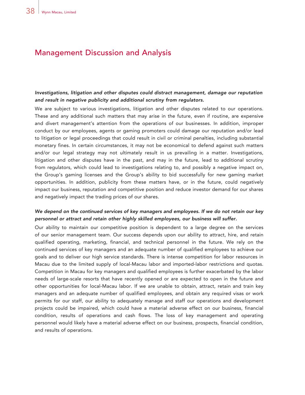 38 Wynn Macau, Limited Management Discussion and Analysis Investigations, litigation and other disputes could distract management, damage our reputation and result in negative publicity and additional scrutiny from regulators. We are subject to various investigations, litigation and other disputes related to our operations. These and any additional such matters that may arise in the future, even if routine, are expensive and divert management’s attention from the operations of our businesses. In addition, improper conduct by our employees, agents or gaming promoters could damage our reputation and/or lead to litigation or legal proceedings that could result in civil or criminal penalties, including substantial monetary fines. In certain circumstances, it may not be economical to defend against such matters and/or our legal strategy may not ultimately result in us prevailing in a matter. Investigations, litigation and other disputes have in the past, and may in the future, lead to additional scrutiny from regulators, which could lead to investigations relating to, and possibly a negative impact on, the Group’s gaming licenses and the Group’s ability to bid successfully for new gaming market opportunities. In addition, publicity from these matters have, or in the future, could negatively impact our business, reputation and competitive position and reduce investor demand for our shares and negatively impact the trading prices of our shares. We depend on the continued services of key managers and employees. If we do not retain our key personnel or attract and retain other highly skilled employees, our business will suffer. Our ability to maintain our competitive position is dependent to a large degree on the services of our senior management team. Our success depends upon our ability to attract, hire, and retain qualified operating, marketing, financial, and technical personnel in the future. We rely on the continued services of key managers and an adequate number of qualified employees to achieve our goals and to deliver our high service standards. There is intense competition for labor resources in Macau due to the limited supply of local-Macau labor and imported-labor restrictions and quotas. Competition in Macau for key managers and qualified employees is further exacerbated by the labor needs of large-scale resorts that have recently opened or are expected to open in the future and other opportunities for local-Macau labor. If we are unable to obtain, attract, retain and train key managers and an adequate number of qualified employees, and obtain any required visas or work permits for our staff, our ability to adequately manage and staff our operations and development projects could be impaired, which could have a material adverse effect on our business, financial condition, results of operations and cash flows. The loss of key management and operating personnel would likely have a material adverse effect on our business, prospects, financial condition, and results of operations.