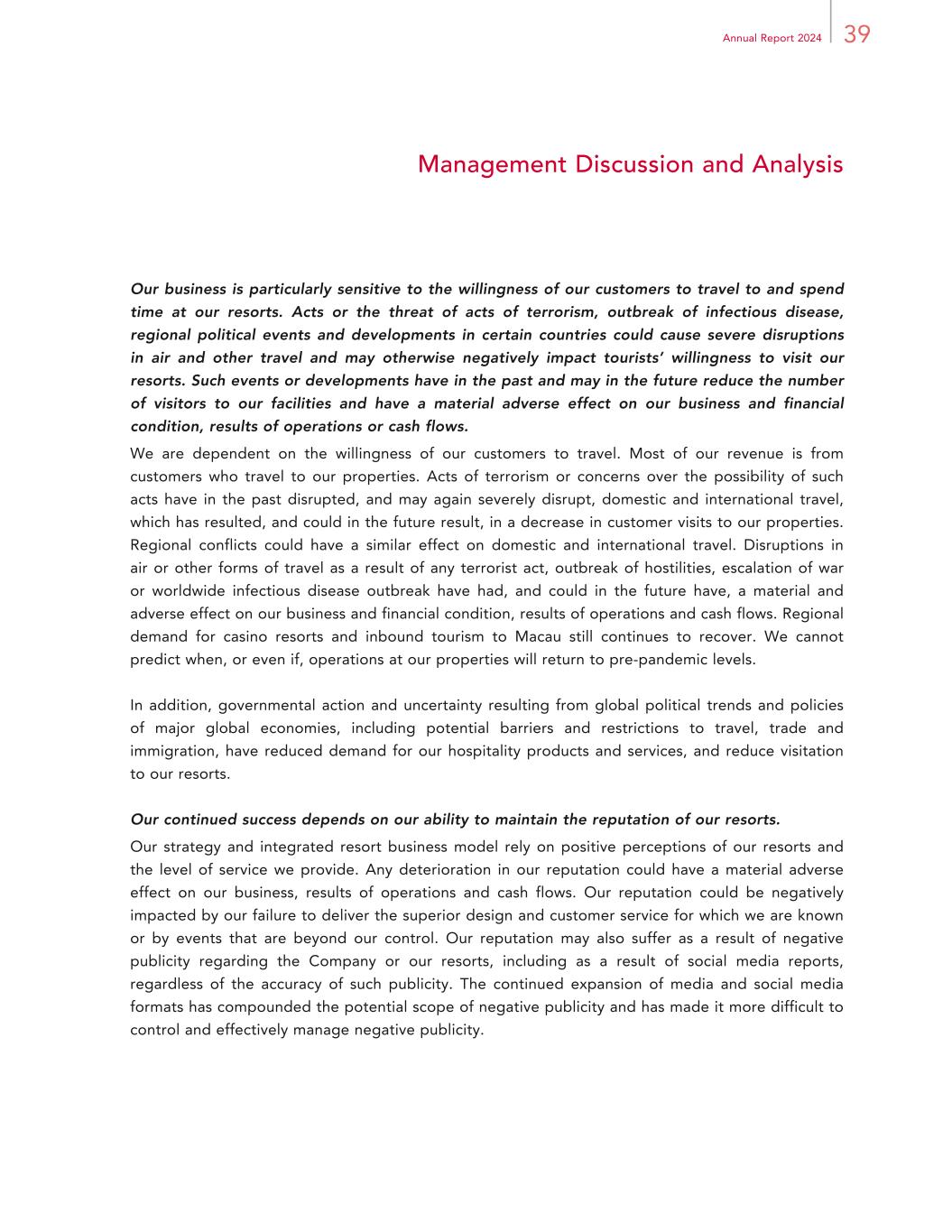 39Annual Report 2024 Management Discussion and Analysis Our business is particularly sensitive to the willingness of our customers to travel to and spend time at our resorts. Acts or the threat of acts of terrorism, outbreak of infectious disease, regional political events and developments in certain countries could cause severe disruptions in air and other travel and may otherwise negatively impact tourists’ willingness to visit our resorts. Such events or developments have in the past and may in the future reduce the number of visitors to our facilities and have a material adverse effect on our business and financial condition, results of operations or cash flows. We are dependent on the willingness of our customers to travel. Most of our revenue is from customers who travel to our properties. Acts of terrorism or concerns over the possibility of such acts have in the past disrupted, and may again severely disrupt, domestic and international travel, which has resulted, and could in the future result, in a decrease in customer visits to our properties. Regional conflicts could have a similar effect on domestic and international travel. Disruptions in air or other forms of travel as a result of any terrorist act, outbreak of hostilities, escalation of war or worldwide infectious disease outbreak have had, and could in the future have, a material and adverse effect on our business and financial condition, results of operations and cash flows. Regional demand for casino resorts and inbound tourism to Macau still continues to recover. We cannot predict when, or even if, operations at our properties will return to pre-pandemic levels. In addition, governmental action and uncertainty resulting from global political trends and policies of major global economies, including potential barriers and restrictions to travel, trade and immigration, have reduced demand for our hospitality products and services, and reduce visitation to our resorts. Our continued success depends on our ability to maintain the reputation of our resorts. Our strategy and integrated resort business model rely on positive perceptions of our resorts and the level of service we provide. Any deterioration in our reputation could have a material adverse effect on our business, results of operations and cash flows. Our reputation could be negatively impacted by our failure to deliver the superior design and customer service for which we are known or by events that are beyond our control. Our reputation may also suffer as a result of negative publicity regarding the Company or our resorts, including as a result of social media reports, regardless of the accuracy of such publicity. The continued expansion of media and social media formats has compounded the potential scope of negative publicity and has made it more difficult to control and effectively manage negative publicity.