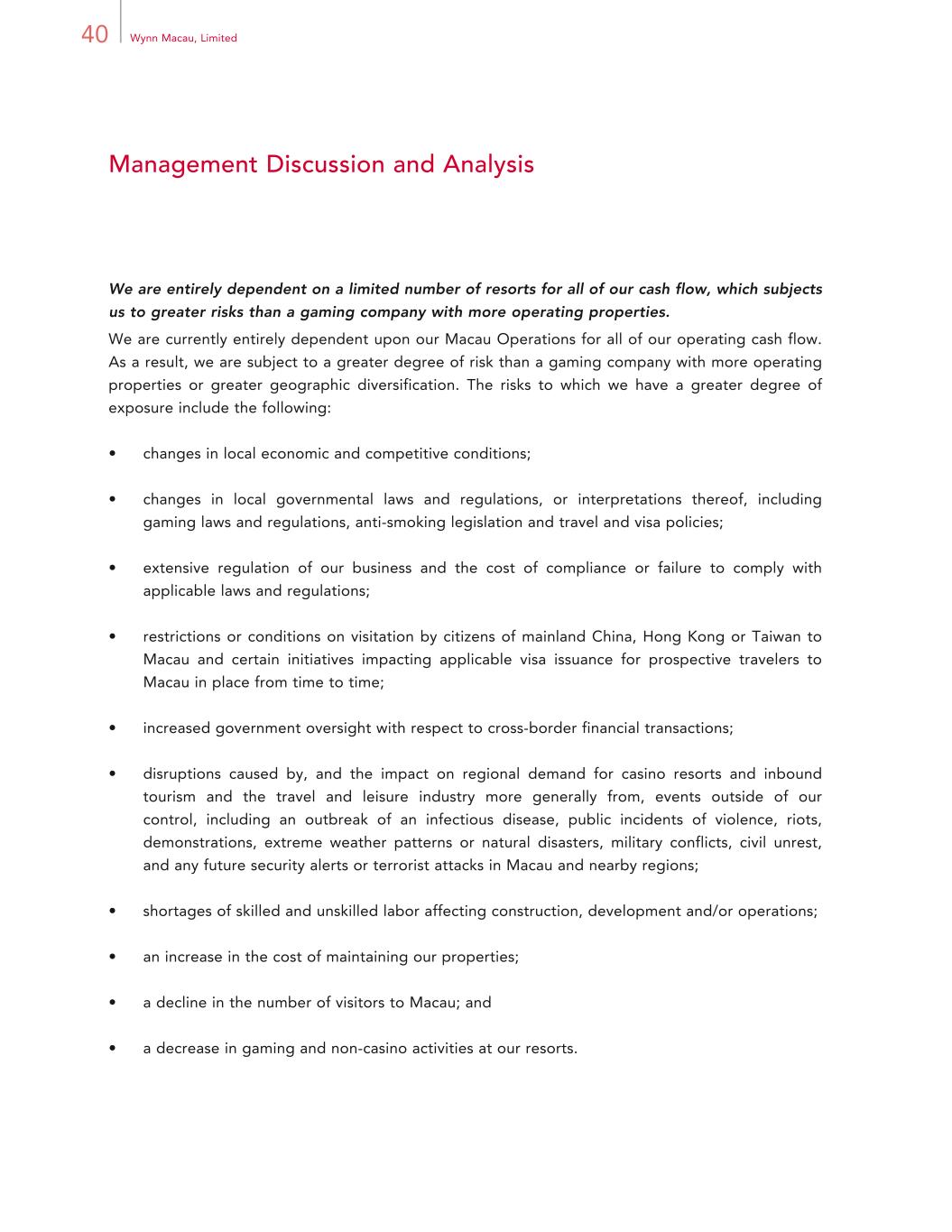 40 Wynn Macau, Limited Management Discussion and Analysis We are entirely dependent on a limited number of resorts for all of our cash flow, which subjects us to greater risks than a gaming company with more operating properties. We are currently entirely dependent upon our Macau Operations for all of our operating cash flow. As a result, we are subject to a greater degree of risk than a gaming company with more operating properties or greater geographic diversification. The risks to which we have a greater degree of exposure include the following: • changes in local economic and competitive conditions; • changes in local governmental laws and regulations, or interpretations thereof, including gaming laws and regulations, anti-smoking legislation and travel and visa policies; • extensive regulation of our business and the cost of compliance or failure to comply with applicable laws and regulations; • restrictions or conditions on visitation by citizens of mainland China, Hong Kong or Taiwan to Macau and certain initiatives impacting applicable visa issuance for prospective travelers to Macau in place from time to time; • increased government oversight with respect to cross-border financial transactions; • disruptions caused by, and the impact on regional demand for casino resorts and inbound tourism and the travel and leisure industry more generally from, events outside of our control, including an outbreak of an infectious disease, public incidents of violence, riots, demonstrations, extreme weather patterns or natural disasters, military conflicts, civil unrest, and any future security alerts or terrorist attacks in Macau and nearby regions; • shortages of skilled and unskilled labor affecting construction, development and/or operations; • an increase in the cost of maintaining our properties; • a decline in the number of visitors to Macau; and • a decrease in gaming and non-casino activities at our resorts.