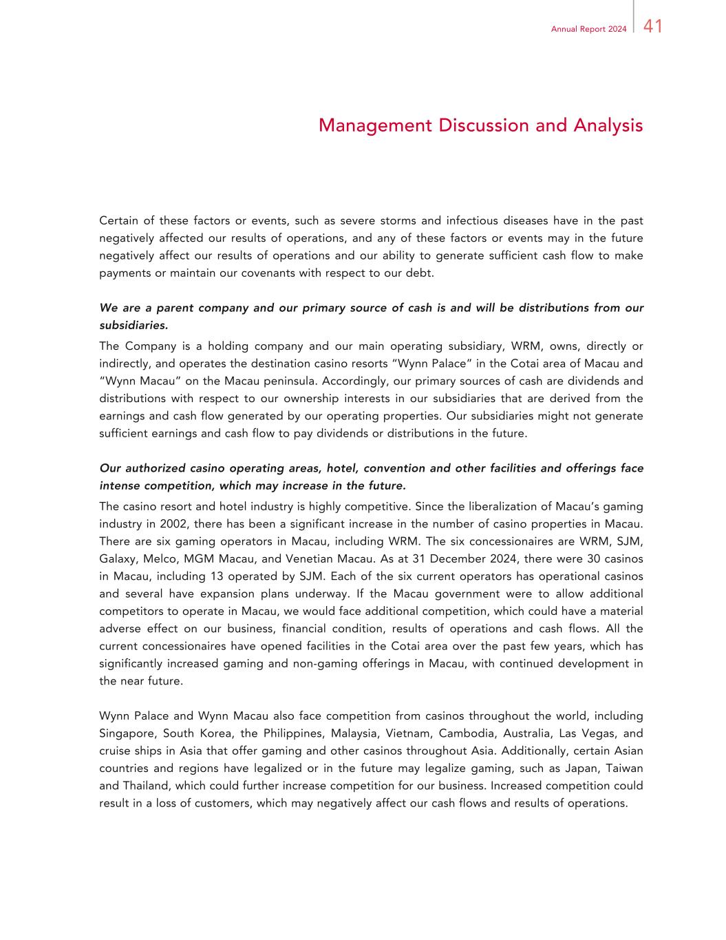 41Annual Report 2024 Management Discussion and Analysis Certain of these factors or events, such as severe storms and infectious diseases have in the past negatively affected our results of operations, and any of these factors or events may in the future negatively affect our results of operations and our ability to generate sufficient cash flow to make payments or maintain our covenants with respect to our debt. We are a parent company and our primary source of cash is and will be distributions from our subsidiaries. The Company is a holding company and our main operating subsidiary, WRM, owns, directly or indirectly, and operates the destination casino resorts “Wynn Palace” in the Cotai area of Macau and “Wynn Macau” on the Macau peninsula. Accordingly, our primary sources of cash are dividends and distributions with respect to our ownership interests in our subsidiaries that are derived from the earnings and cash flow generated by our operating properties. Our subsidiaries might not generate sufficient earnings and cash flow to pay dividends or distributions in the future. Our authorized casino operating areas, hotel, convention and other facilities and offerings face intense competition, which may increase in the future. The casino resort and hotel industry is highly competitive. Since the liberalization of Macau’s gaming industry in 2002, there has been a significant increase in the number of casino properties in Macau. There are six gaming operators in Macau, including WRM. The six concessionaires are WRM, SJM, Galaxy, Melco, MGM Macau, and Venetian Macau. As at 31 December 2024, there were 30 casinos in Macau, including 13 operated by SJM. Each of the six current operators has operational casinos and several have expansion plans underway. If the Macau government were to allow additional competitors to operate in Macau, we would face additional competition, which could have a material adverse effect on our business, financial condition, results of operations and cash flows. All the current concessionaires have opened facilities in the Cotai area over the past few years, which has significantly increased gaming and non-gaming offerings in Macau, with continued development in the near future. Wynn Palace and Wynn Macau also face competition from casinos throughout the world, including Singapore, South Korea, the Philippines, Malaysia, Vietnam, Cambodia, Australia, Las Vegas, and cruise ships in Asia that offer gaming and other casinos throughout Asia. Additionally, certain Asian countries and regions have legalized or in the future may legalize gaming, such as Japan, Taiwan and Thailand, which could further increase competition for our business. Increased competition could result in a loss of customers, which may negatively affect our cash flows and results of operations.