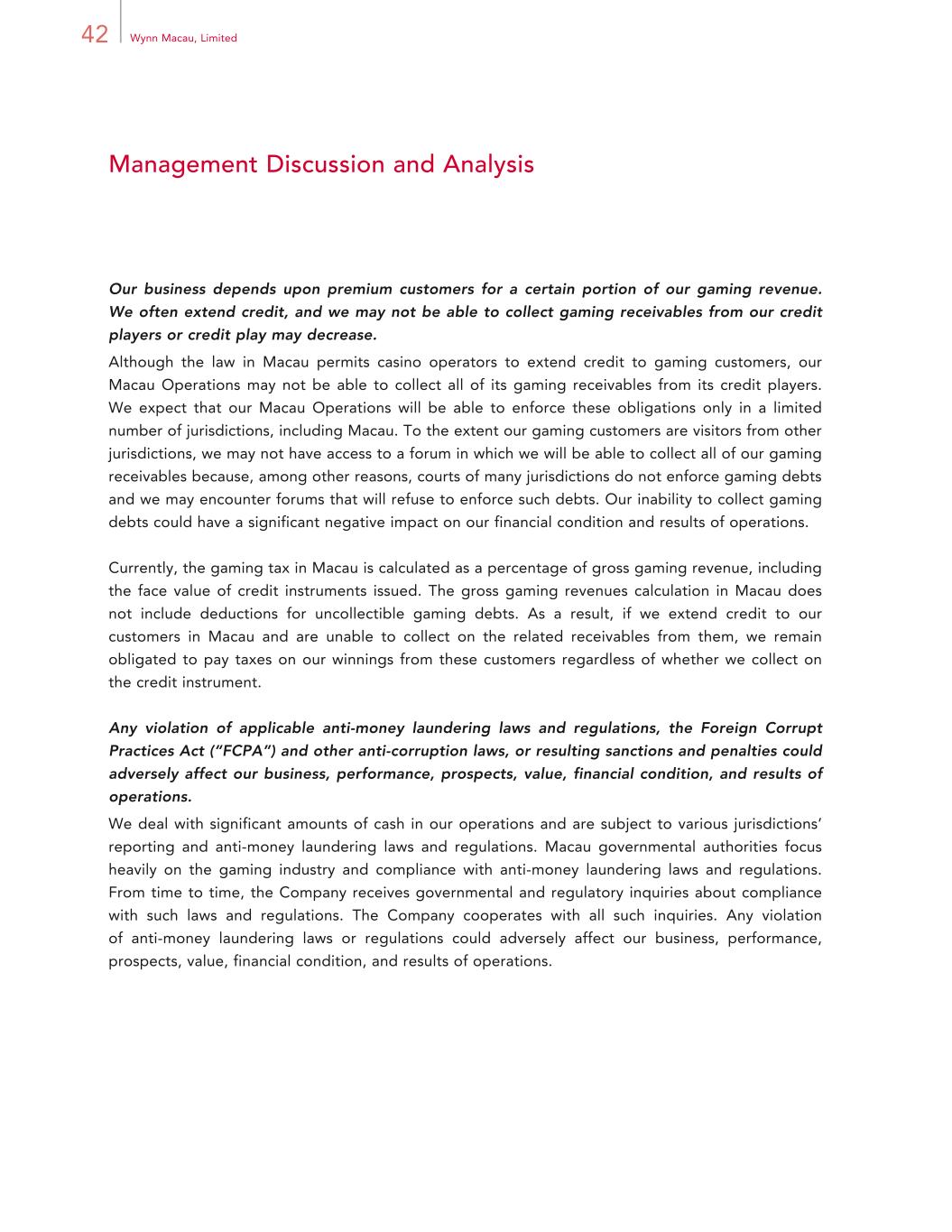 42 Wynn Macau, Limited Management Discussion and Analysis Our business depends upon premium customers for a certain portion of our gaming revenue. We often extend credit, and we may not be able to collect gaming receivables from our credit players or credit play may decrease. Although the law in Macau permits casino operators to extend credit to gaming customers, our Macau Operations may not be able to collect all of its gaming receivables from its credit players. We expect that our Macau Operations will be able to enforce these obligations only in a limited number of jurisdictions, including Macau. To the extent our gaming customers are visitors from other jurisdictions, we may not have access to a forum in which we will be able to collect all of our gaming receivables because, among other reasons, courts of many jurisdictions do not enforce gaming debts and we may encounter forums that will refuse to enforce such debts. Our inability to collect gaming debts could have a significant negative impact on our financial condition and results of operations. Currently, the gaming tax in Macau is calculated as a percentage of gross gaming revenue, including the face value of credit instruments issued. The gross gaming revenues calculation in Macau does not include deductions for uncollectible gaming debts. As a result, if we extend credit to our customers in Macau and are unable to collect on the related receivables from them, we remain obligated to pay taxes on our winnings from these customers regardless of whether we collect on the credit instrument. Any violation of applicable anti-money laundering laws and regulations, the Foreign Corrupt Practices Act (“FCPA”) and other anti-corruption laws, or resulting sanctions and penalties could adversely affect our business, performance, prospects, value, financial condition, and results of operations. We deal with significant amounts of cash in our operations and are subject to various jurisdictions’ reporting and anti-money laundering laws and regulations. Macau governmental authorities focus heavily on the gaming industry and compliance with anti-money laundering laws and regulations. From time to time, the Company receives governmental and regulatory inquiries about compliance with such laws and regulations. The Company cooperates with all such inquiries. Any violation of anti-money laundering laws or regulations could adversely affect our business, performance, prospects, value, financial condition, and results of operations.