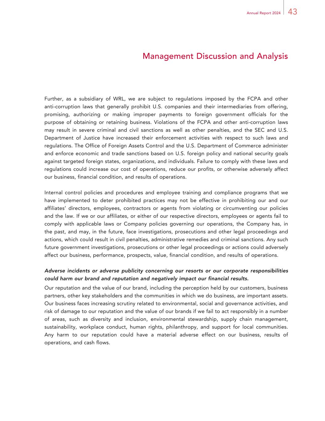 43Annual Report 2024 Management Discussion and Analysis Further, as a subsidiary of WRL, we are subject to regulations imposed by the FCPA and other anti-corruption laws that generally prohibit U.S. companies and their intermediaries from offering, promising, authorizing or making improper payments to foreign government officials for the purpose of obtaining or retaining business. Violations of the FCPA and other anti-corruption laws may result in severe criminal and civil sanctions as well as other penalties, and the SEC and U.S. Department of Justice have increased their enforcement activities with respect to such laws and regulations. The Office of Foreign Assets Control and the U.S. Department of Commerce administer and enforce economic and trade sanctions based on U.S. foreign policy and national security goals against targeted foreign states, organizations, and individuals. Failure to comply with these laws and regulations could increase our cost of operations, reduce our profits, or otherwise adversely affect our business, financial condition, and results of operations. Internal control policies and procedures and employee training and compliance programs that we have implemented to deter prohibited practices may not be effective in prohibiting our and our affiliates’ directors, employees, contractors or agents from violating or circumventing our policies and the law. If we or our affiliates, or either of our respective directors, employees or agents fail to comply with applicable laws or Company policies governing our operations, the Company has, in the past, and may, in the future, face investigations, prosecutions and other legal proceedings and actions, which could result in civil penalties, administrative remedies and criminal sanctions. Any such future government investigations, prosecutions or other legal proceedings or actions could adversely affect our business, performance, prospects, value, financial condition, and results of operations. Adverse incidents or adverse publicity concerning our resorts or our corporate responsibilities could harm our brand and reputation and negatively impact our financial results. Our reputation and the value of our brand, including the perception held by our customers, business partners, other key stakeholders and the communities in which we do business, are important assets. Our business faces increasing scrutiny related to environmental, social and governance activities, and risk of damage to our reputation and the value of our brands if we fail to act responsibly in a number of areas, such as diversity and inclusion, environmental stewardship, supply chain management, sustainability, workplace conduct, human rights, philanthropy, and support for local communities. Any harm to our reputation could have a material adverse effect on our business, results of operations, and cash flows.
