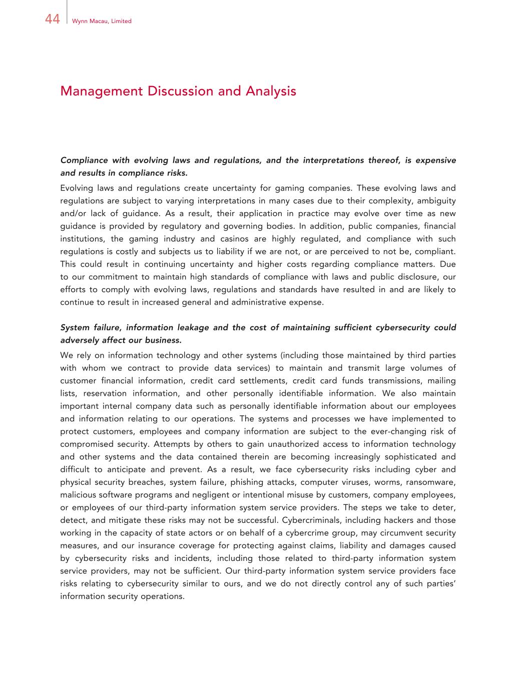 44 Wynn Macau, Limited Management Discussion and Analysis Compliance with evolving laws and regulations, and the interpretations thereof, is expensive and results in compliance risks. Evolving laws and regulations create uncertainty for gaming companies. These evolving laws and regulations are subject to varying interpretations in many cases due to their complexity, ambiguity and/or lack of guidance. As a result, their application in practice may evolve over time as new guidance is provided by regulatory and governing bodies. In addition, public companies, financial institutions, the gaming industry and casinos are highly regulated, and compliance with such regulations is costly and subjects us to liability if we are not, or are perceived to not be, compliant. This could result in continuing uncertainty and higher costs regarding compliance matters. Due to our commitment to maintain high standards of compliance with laws and public disclosure, our efforts to comply with evolving laws, regulations and standards have resulted in and are likely to continue to result in increased general and administrative expense. System failure, information leakage and the cost of maintaining sufficient cybersecurity could adversely affect our business. We rely on information technology and other systems (including those maintained by third parties with whom we contract to provide data services) to maintain and transmit large volumes of customer financial information, credit card settlements, credit card funds transmissions, mailing lists, reservation information, and other personally identifiable information. We also maintain important internal company data such as personally identifiable information about our employees and information relating to our operations. The systems and processes we have implemented to protect customers, employees and company information are subject to the ever-changing risk of compromised security. Attempts by others to gain unauthorized access to information technology and other systems and the data contained therein are becoming increasingly sophisticated and difficult to anticipate and prevent. As a result, we face cybersecurity risks including cyber and physical security breaches, system failure, phishing attacks, computer viruses, worms, ransomware, malicious software programs and negligent or intentional misuse by customers, company employees, or employees of our third-party information system service providers. The steps we take to deter, detect, and mitigate these risks may not be successful. Cybercriminals, including hackers and those working in the capacity of state actors or on behalf of a cybercrime group, may circumvent security measures, and our insurance coverage for protecting against claims, liability and damages caused by cybersecurity risks and incidents, including those related to third-party information system service providers, may not be sufficient. Our third-party information system service providers face risks relating to cybersecurity similar to ours, and we do not directly control any of such parties’ information security operations.