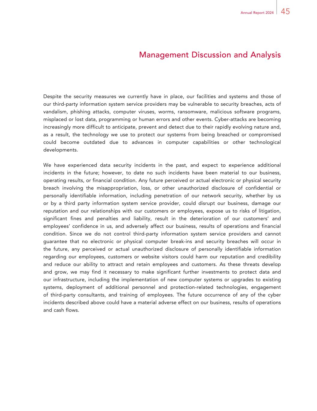 45Annual Report 2024 Management Discussion and Analysis Despite the security measures we currently have in place, our facilities and systems and those of our third-party information system service providers may be vulnerable to security breaches, acts of vandalism, phishing attacks, computer viruses, worms, ransomware, malicious software programs, misplaced or lost data, programming or human errors and other events. Cyber-attacks are becoming increasingly more difficult to anticipate, prevent and detect due to their rapidly evolving nature and, as a result, the technology we use to protect our systems from being breached or compromised could become outdated due to advances in computer capabilities or other technological developments. We have experienced data security incidents in the past, and expect to experience additional incidents in the future; however, to date no such incidents have been material to our business, operating results, or financial condition. Any future perceived or actual electronic or physical security breach involving the misappropriation, loss, or other unauthorized disclosure of confidential or personally identifiable information, including penetration of our network security, whether by us or by a third party information system service provider, could disrupt our business, damage our reputation and our relationships with our customers or employees, expose us to risks of litigation, significant fines and penalties and liability, result in the deterioration of our customers’ and employees’ confidence in us, and adversely affect our business, results of operations and financial condition. Since we do not control third-party information system service providers and cannot guarantee that no electronic or physical computer break-ins and security breaches will occur in the future, any perceived or actual unauthorized disclosure of personally identifiable information regarding our employees, customers or website visitors could harm our reputation and credibility and reduce our ability to attract and retain employees and customers. As these threats develop and grow, we may find it necessary to make significant further investments to protect data and our infrastructure, including the implementation of new computer systems or upgrades to existing systems, deployment of additional personnel and protection-related technologies, engagement of third-party consultants, and training of employees. The future occurrence of any of the cyber incidents described above could have a material adverse effect on our business, results of operations and cash flows.