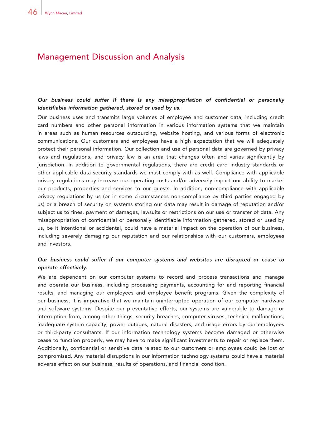 46 Wynn Macau, Limited Management Discussion and Analysis Our business could suffer if there is any misappropriation of confidential or personally identifiable information gathered, stored or used by us. Our business uses and transmits large volumes of employee and customer data, including credit card numbers and other personal information in various information systems that we maintain in areas such as human resources outsourcing, website hosting, and various forms of electronic communications. Our customers and employees have a high expectation that we will adequately protect their personal information. Our collection and use of personal data are governed by privacy laws and regulations, and privacy law is an area that changes often and varies significantly by jurisdiction. In addition to governmental regulations, there are credit card industry standards or other applicable data security standards we must comply with as well. Compliance with applicable privacy regulations may increase our operating costs and/or adversely impact our ability to market our products, properties and services to our guests. In addition, non-compliance with applicable privacy regulations by us (or in some circumstances non-compliance by third parties engaged by us) or a breach of security on systems storing our data may result in damage of reputation and/or subject us to fines, payment of damages, lawsuits or restrictions on our use or transfer of data. Any misappropriation of confidential or personally identifiable information gathered, stored or used by us, be it intentional or accidental, could have a material impact on the operation of our business, including severely damaging our reputation and our relationships with our customers, employees and investors. Our business could suffer if our computer systems and websites are disrupted or cease to operate effectively. We are dependent on our computer systems to record and process transactions and manage and operate our business, including processing payments, accounting for and reporting financial results, and managing our employees and employee benefit programs. Given the complexity of our business, it is imperative that we maintain uninterrupted operation of our computer hardware and software systems. Despite our preventative efforts, our systems are vulnerable to damage or interruption from, among other things, security breaches, computer viruses, technical malfunctions, inadequate system capacity, power outages, natural disasters, and usage errors by our employees or third-party consultants. If our information technology systems become damaged or otherwise cease to function properly, we may have to make significant investments to repair or replace them. Additionally, confidential or sensitive data related to our customers or employees could be lost or compromised. Any material disruptions in our information technology systems could have a material adverse effect on our business, results of operations, and financial condition.