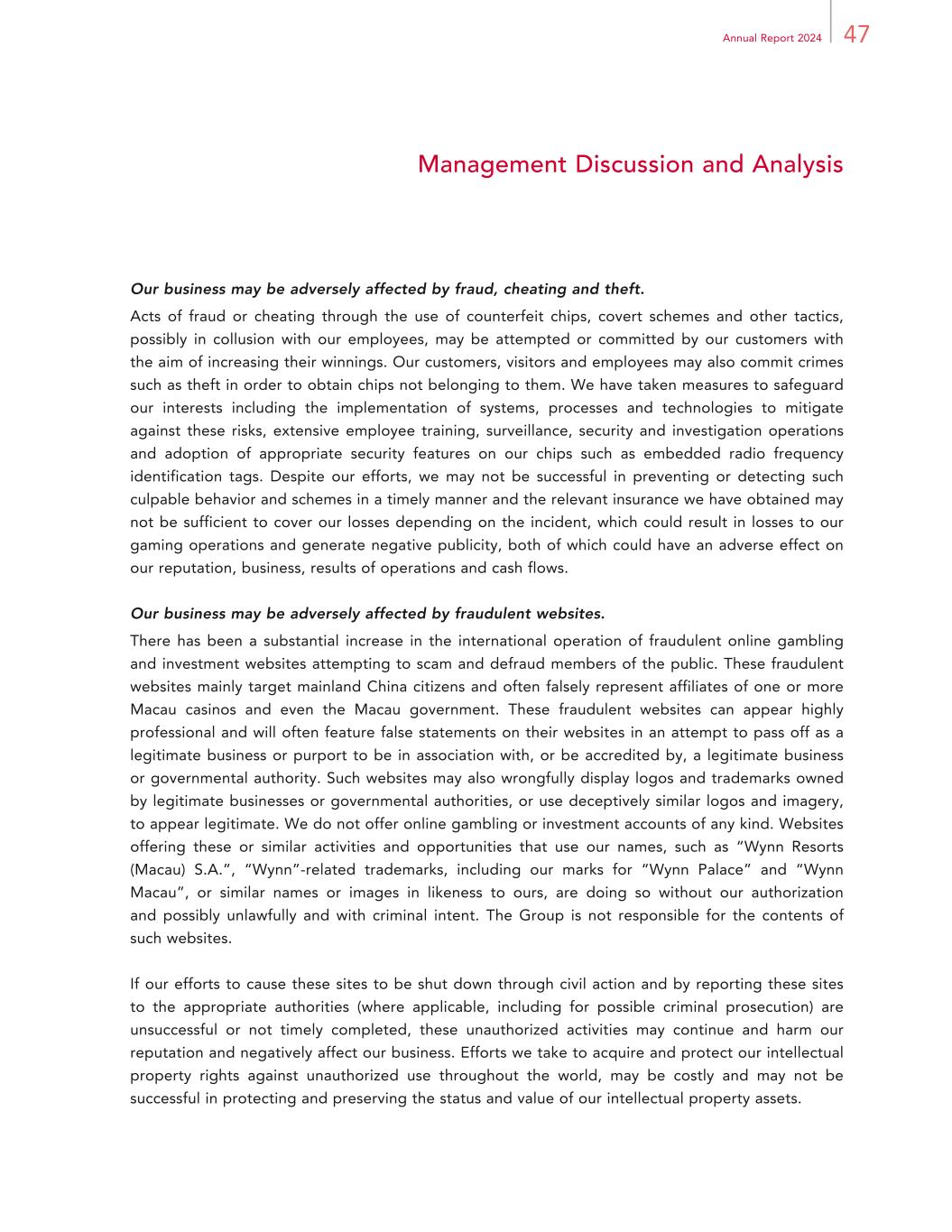 47Annual Report 2024 Management Discussion and Analysis Our business may be adversely affected by fraud, cheating and theft. Acts of fraud or cheating through the use of counterfeit chips, covert schemes and other tactics, possibly in collusion with our employees, may be attempted or committed by our customers with the aim of increasing their winnings. Our customers, visitors and employees may also commit crimes such as theft in order to obtain chips not belonging to them. We have taken measures to safeguard our interests including the implementation of systems, processes and technologies to mitigate against these risks, extensive employee training, surveillance, security and investigation operations and adoption of appropriate security features on our chips such as embedded radio frequency identification tags. Despite our efforts, we may not be successful in preventing or detecting such culpable behavior and schemes in a timely manner and the relevant insurance we have obtained may not be sufficient to cover our losses depending on the incident, which could result in losses to our gaming operations and generate negative publicity, both of which could have an adverse effect on our reputation, business, results of operations and cash flows. Our business may be adversely affected by fraudulent websites. There has been a substantial increase in the international operation of fraudulent online gambling and investment websites attempting to scam and defraud members of the public. These fraudulent websites mainly target mainland China citizens and often falsely represent affiliates of one or more Macau casinos and even the Macau government. These fraudulent websites can appear highly professional and will often feature false statements on their websites in an attempt to pass off as a legitimate business or purport to be in association with, or be accredited by, a legitimate business or governmental authority. Such websites may also wrongfully display logos and trademarks owned by legitimate businesses or governmental authorities, or use deceptively similar logos and imagery, to appear legitimate. We do not offer online gambling or investment accounts of any kind. Websites offering these or similar activities and opportunities that use our names, such as “Wynn Resorts (Macau) S.A.”, “Wynn”-related trademarks, including our marks for “Wynn Palace” and “Wynn Macau”, or similar names or images in likeness to ours, are doing so without our authorization and possibly unlawfully and with criminal intent. The Group is not responsible for the contents of such websites. If our efforts to cause these sites to be shut down through civil action and by reporting these sites to the appropriate authorities (where applicable, including for possible criminal prosecution) are unsuccessful or not timely completed, these unauthorized activities may continue and harm our reputation and negatively affect our business. Efforts we take to acquire and protect our intellectual property rights against unauthorized use throughout the world, may be costly and may not be successful in protecting and preserving the status and value of our intellectual property assets.