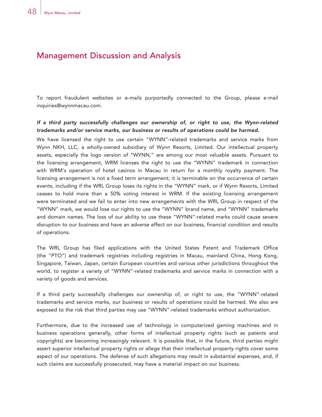 48 Wynn Macau, Limited Management Discussion and Analysis To report fraudulent websites or e-mails purportedly connected to the Group, please e-mail inquiries@wynnmacau.com. If a third party successfully challenges our ownership of, or right to use, the Wynn-related trademarks and/or service marks, our business or results of operations could be harmed. We have licensed the right to use certain “WYNN”-related trademarks and service marks from Wynn NKH, LLC, a wholly-owned subsidiary of Wynn Resorts, Limited. Our intellectual property assets, especially the logo version of “WYNN,” are among our most valuable assets. Pursuant to the licensing arrangement, WRM licenses the right to use the “WYNN” trademark in connection with WRM’s operation of hotel casinos in Macau in return for a monthly royalty payment. The licensing arrangement is not a fixed term arrangement; it is terminable on the occurrence of certain events, including if the WRL Group loses its rights in the “WYNN” mark, or if Wynn Resorts, Limited ceases to hold more than a 50% voting interest in WRM. If the existing licensing arrangement were terminated and we fail to enter into new arrangements with the WRL Group in respect of the “WYNN” mark, we would lose our rights to use the “WYNN” brand name, and “WYNN” trademarks and domain names. The loss of our ability to use these “WYNN”-related marks could cause severe disruption to our business and have an adverse effect on our business, financial condition and results of operations. The WRL Group has filed applications with the United States Patent and Trademark Office (the “PTO”) and trademark registries including registries in Macau, mainland China, Hong Kong, Singapore, Taiwan, Japan, certain European countries and various other jurisdictions throughout the world, to register a variety of “WYNN”-related trademarks and service marks in connection with a variety of goods and services. If a third party successfully challenges our ownership of, or right to use, the “WYNN”-related trademarks and service marks, our business or results of operations could be harmed. We also are exposed to the risk that third parties may use “WYNN”-related trademarks without authorization. Furthermore, due to the increased use of technology in computerized gaming machines and in business operations generally, other forms of intellectual property rights (such as patents and copyrights) are becoming increasingly relevant. It is possible that, in the future, third parties might assert superior intellectual property rights or allege that their intellectual property rights cover some aspect of our operations. The defense of such allegations may result in substantial expenses, and, if such claims are successfully prosecuted, may have a material impact on our business.