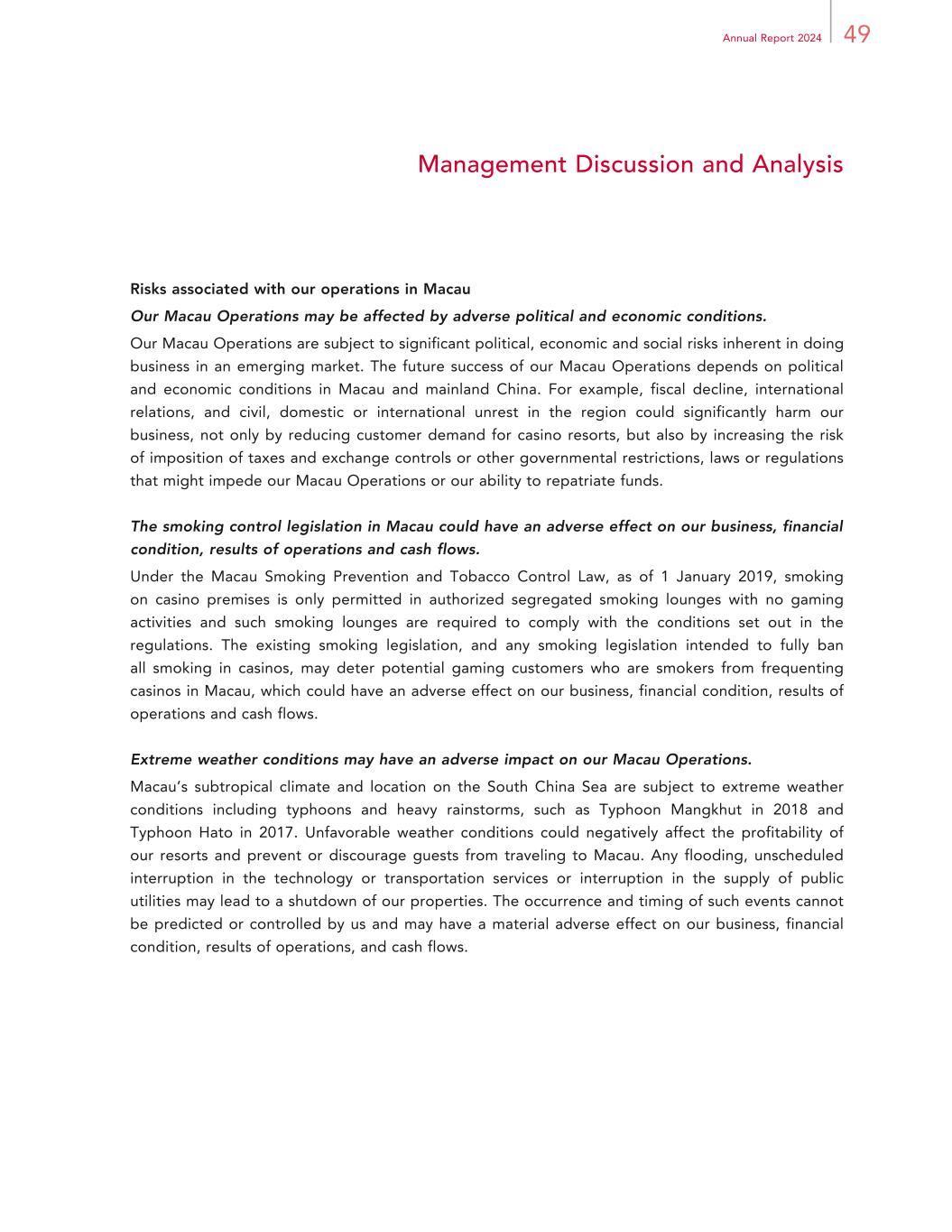 49Annual Report 2024 Management Discussion and Analysis Risks associated with our operations in Macau Our Macau Operations may be affected by adverse political and economic conditions. Our Macau Operations are subject to significant political, economic and social risks inherent in doing business in an emerging market. The future success of our Macau Operations depends on political and economic conditions in Macau and mainland China. For example, fiscal decline, international relations, and civil, domestic or international unrest in the region could significantly harm our business, not only by reducing customer demand for casino resorts, but also by increasing the risk of imposition of taxes and exchange controls or other governmental restrictions, laws or regulations that might impede our Macau Operations or our ability to repatriate funds. The smoking control legislation in Macau could have an adverse effect on our business, financial condition, results of operations and cash flows. Under the Macau Smoking Prevention and Tobacco Control Law, as of 1 January 2019, smoking on casino premises is only permitted in authorized segregated smoking lounges with no gaming activities and such smoking lounges are required to comply with the conditions set out in the regulations. The existing smoking legislation, and any smoking legislation intended to fully ban all smoking in casinos, may deter potential gaming customers who are smokers from frequenting casinos in Macau, which could have an adverse effect on our business, financial condition, results of operations and cash flows. Extreme weather conditions may have an adverse impact on our Macau Operations. Macau’s subtropical climate and location on the South China Sea are subject to extreme weather conditions including typhoons and heavy rainstorms, such as Typhoon Mangkhut in 2018 and Typhoon Hato in 2017. Unfavorable weather conditions could negatively affect the profitability of our resorts and prevent or discourage guests from traveling to Macau. Any flooding, unscheduled interruption in the technology or transportation services or interruption in the supply of public utilities may lead to a shutdown of our properties. The occurrence and timing of such events cannot be predicted or controlled by us and may have a material adverse effect on our business, financial condition, results of operations, and cash flows.